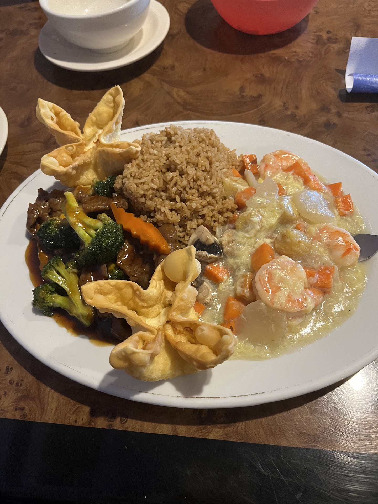 We ordered two combo plates and two small wonton soups. The bill was much more expensive than our usual Chinese spots, and unfortunately the quality didnāt measure up at all. The wonton soup was good but everything else was dismal. I got fried rice, broccoli beef and shrimp with lobster sauce. Everything was too salty and artificial tasting. It was gross in all honesty. The āfried riceā was just that; rice fried in oil. NO egg, no veggies, no bits of pork. It was just straight up oily brown rice. My husband also received the oily fried rice with sweet and sour pork and general chicken. He said both entrees were just okay, but he couldnāt even use the sweet and sour sauce because it was too sweet and gloopy like a syrup. Our crabmeat Rangoons, as advertised on the menu, had no crab or green onion inside it, and instead were just too big a glob of sour tasting cream cheese. The entire meal was disappointing to say the least.