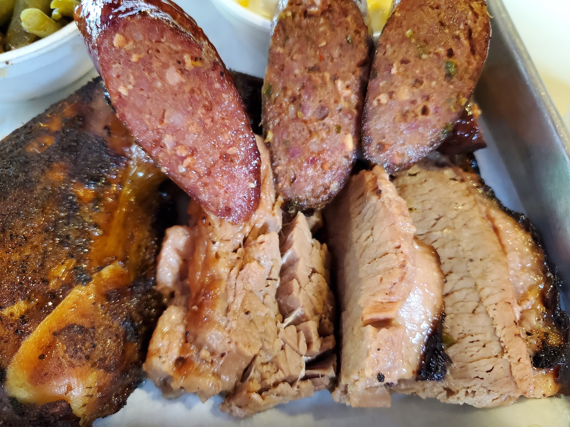 Sides: Pinto beans are homemade and good. Potato Salad is homemade and is good too. Cream corn is decent but a little too thick instead of creamy. Green beans taste perfect! They are long green beans with onions and bits of brisket (I believe or could be salt pork -- I didn't eat those pieces).