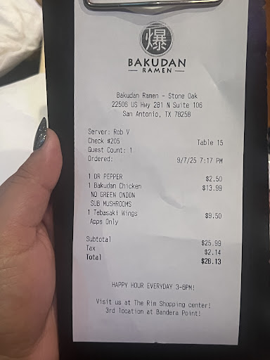 Read moreWe walked into this restaurant and immediately felt like I was in a refrigerator. It was unreasonably cold, so we ended up sitting outside. The server mentioned she wore shorts to work and immediately regretted her decision when walking in. We ordered takoyaki for the table and a pork bao for my friend. The takoyaki was mushy and not as crisp as we were hoping for a fried appetizer. My friend handed her pork bao to her husband and said, "Wanna try this? I don't like it at all." We ordered four bowls of ramen. Both me and my friend were really disappointed with ours. They were virtually flavorless. I got the Bakuda Chicken and it tasted like I was eating very lightly salted noodles with nothing else. There were three thin slices of chicken in the bowl; also not adding any flavor. I waited for the server to return so I could try some add-ons to make the bowl taste better. 10 minutes went by and she didn't come back, so I went into the restaurant and asked for her and she came out. I ordered fried garlic and seasoned eggs for my bowl. The eggs were also not good. You'd think fried garlic would add the kick you need. No. No it didn't. At that point I was thinking, "Do I have COVID? Have I lost my sense of taste?" I sure haven't. As I write this I'm enjoying a delicious dinner at home seasoned only with a sprinkle of pepper and it for sure tops the overpriced noodle water I...