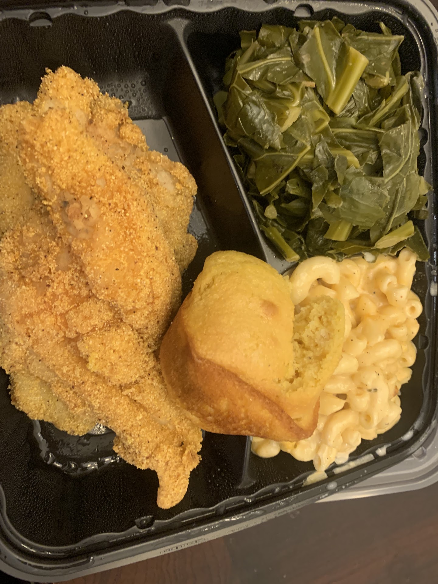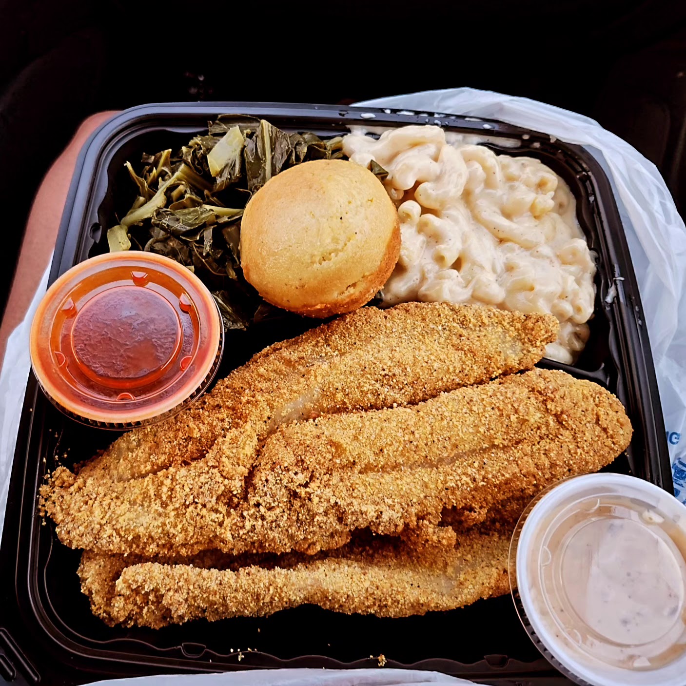 Read moreTried this place out and I’m glad I stopped by. We ordered catfish and collard greens and Mac and cheese, the Mac and cheese is 💣, the collard greens are bitter as they should be and good, the fish was moist and crispy in the outside. I will say I ordered shrimp with my fish and I’m disappointed it did not come with my plate. I got home and my shrimp was missing and I was charged for it. Really bummed about that. My daughter ordered the fettuccine Alfredo it was creamy and yummy she loved that it was cheesy. We also Ordered the steak and cheeese rolls which was a hit everyone of us liked it. Hubby ordered the fried chicken with collard greens and Mac and cheese and loved it all. Ordered banana pudding I wasn’t a fan. It’s more like a banana cake with some whip cream on top I’ll pass on that next time. Parking there’s not a lot of it. But the food is really good. I’ll return I’ll just have to check my bag to make sure all that I ordered is in there. Not leaving with out my shrimp next time. I asked the cashier she said everything was in there. The cashier was nice. She was drinking on the job which I guess she had a modelo. I mean to each it’s own. The food though is good, drinks they had soda and water. She said they are working on Koolaid, I’ll be back. Glad we found this...