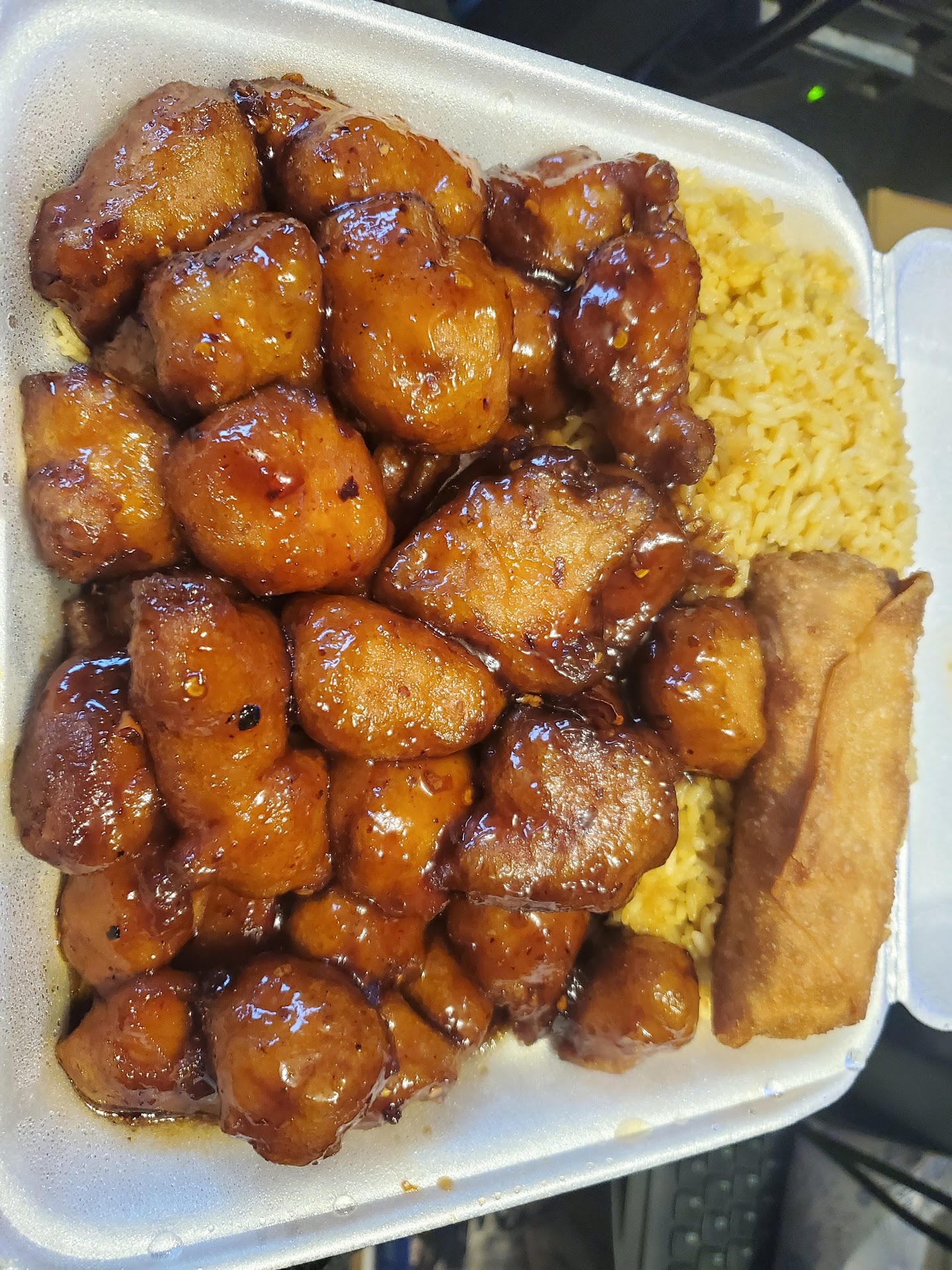 Mom loved the brown sauced (they give an option a brown or white sauce for your mixed vegetables) mixed vegetables. I ordered this as a side dish because everything else is fried. Sweet-and-sour pork portions were very large as well as the lemon chicken. I recommend a teriyaki chicken and the sweetest sour shrimp to share because the portions are large. My family loved the eggrolls but my eggroll was kind of thick skinned I guess? Not bad for a drive-through and they really helped out with a container for all the teas. In this heat it was necessary. Had I known the portion sizes were gonna be so large I would order extra sauces in their own bag because one sweet and sour sauce did spill.