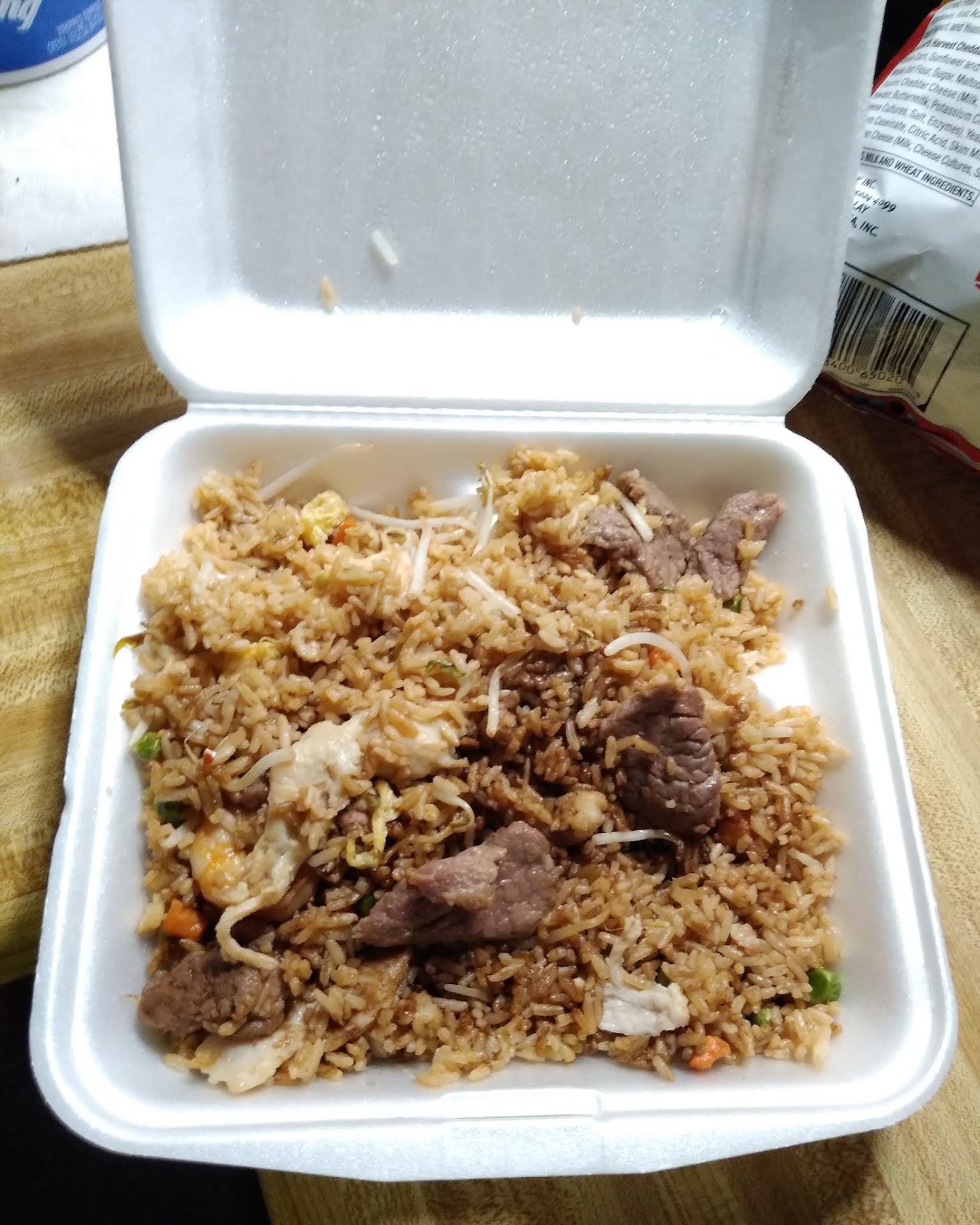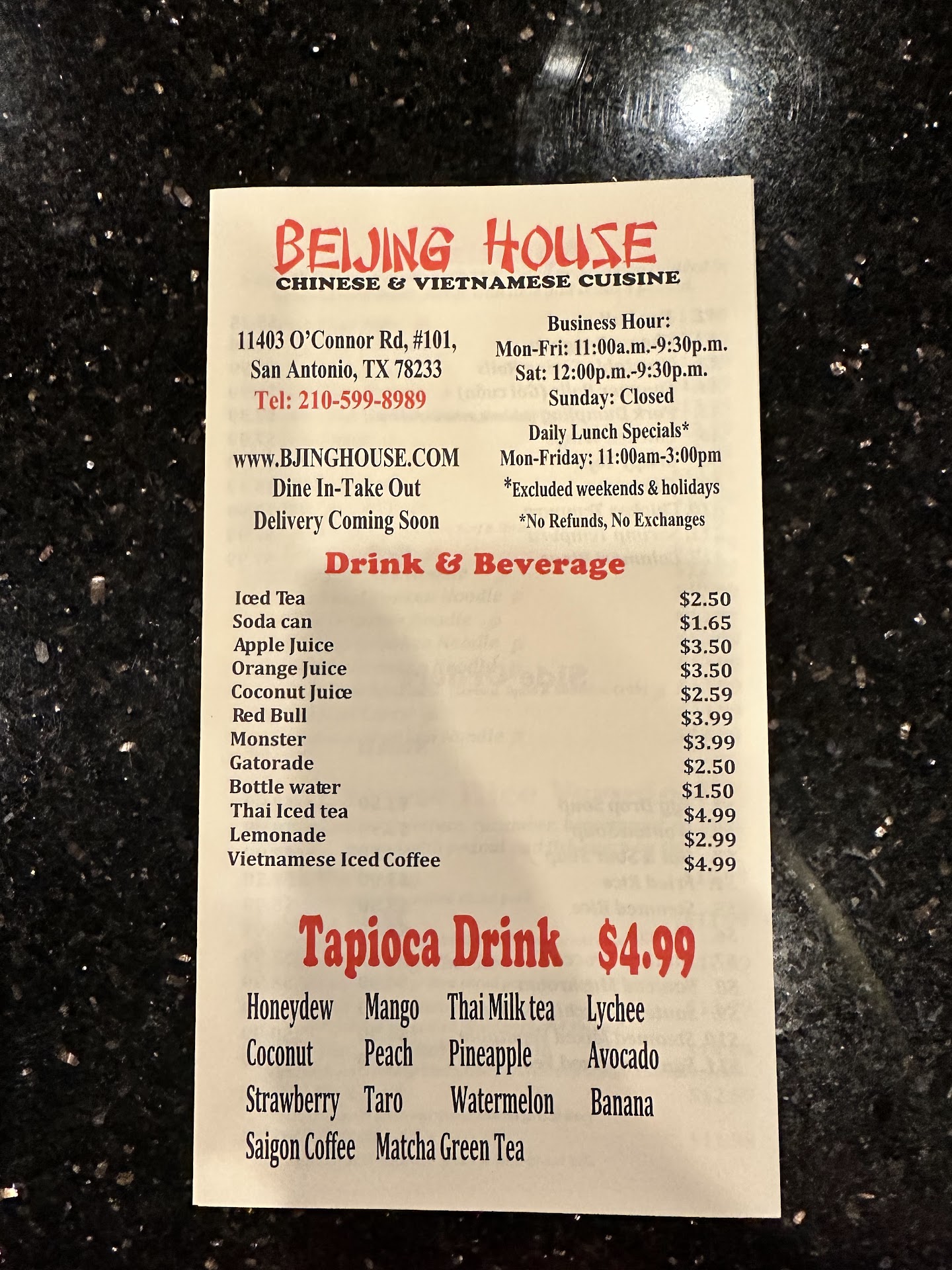 It was clean with friendly staff and smelled wonderful and that's where it ends. I commented to my wife that it was a hefty amount of food and if it tasted like it smelled..woooohoo--spoiler alert...it didn't. We had been craving some decent Asian food for a while, we visited Tokyo Express on Walzem 2 weeks ago which was...mmm okay not bad but not great. My food experience at Beijing House made them seem Michelin starred taste wise. I went in 12/28/2020 and ordered (to go) pork dumplings $5.99 (pot stickers 3 cooking options-steamed-deep fried-pan fried), spring rolls 4-$4.99 and House Fried Rice $10.99 (their "specialty" w/ chicken, beef and shrimp). 1) The dumplings were to be pan fried, the bottoms were lightly browned on most but 2 of them were actually caramelized on the bottom as they should be.. the filling was ample and actually tasty but the lack of proper caramelization meant that by the time I got home (2.5miles away..not a big trip) the ones that had just been briefly put in the pan were gummy and and texturally bleechhh by the time they arrived at home. The spring rolls were decent, a little oily (I'll credit that to being in a to go bag lightly steaming on the drive back) but decent flavor. The dumplings and spring rolls were a comparative feast .. it went downhill fast with the opening of the House Fried Rice (with egg roll.. also not bad..pretty decent)... OK.. This is where I level well earned criticism. My wife asked me to taste it (we were splitting it.. one taking their half and passing it to the other).. and asked me .. "Is this flavorless to you too? Have I suddenly acquired Covid?" It was oversteamed rice with that bad metallic taste that screams "I have been sitting in the hotel pan for a while until the cook noticed me to use" that had a little color like someone added a packet of brown coloring..no actual flavor, very little seasoning.. The chicken was cooked, steamed like..no caramelization no seasoning, the beef was literally steamed grey w/ (you guessed it) no caramelization and no seasoning and the shrimp half were overcooked the other just right and you guessed it.. steamed, no caramelization and no seasoning..none..nada.. zip..zilch. It was literally SO flavorless I added untold amounts of soy sauce and Thai Jugo sauce (which you can see in the pic the color diffs in the rice).. that we both had maybe 7-10 bites each and you know that utter disappointment that just takes your appetite away? Yeah, that.. I do NOT like trashing them (I was hoping we had found a decent place very close to our house) but for $23.78 and charging $11 for your house "specialty".. you damn sure better do it right.. I made a grilled cheese sandwich to fill up after that. The included photos of it are at 1am (just as I am writing this).. as you can see the rice is pale colored, as is the chicken, the beef etc... I took another taste... and it's bad when the bean sprouts in there overpower the taste of the rice.. Will I eat there again? Highly doubtful, I may stop in and get some spring rolls, maybe in the distant future but as for now...color me very unimpressed and disappointed. So tomorrow off to the Asian super store to get some fried rice seasoning packets and redo it at home as a...
