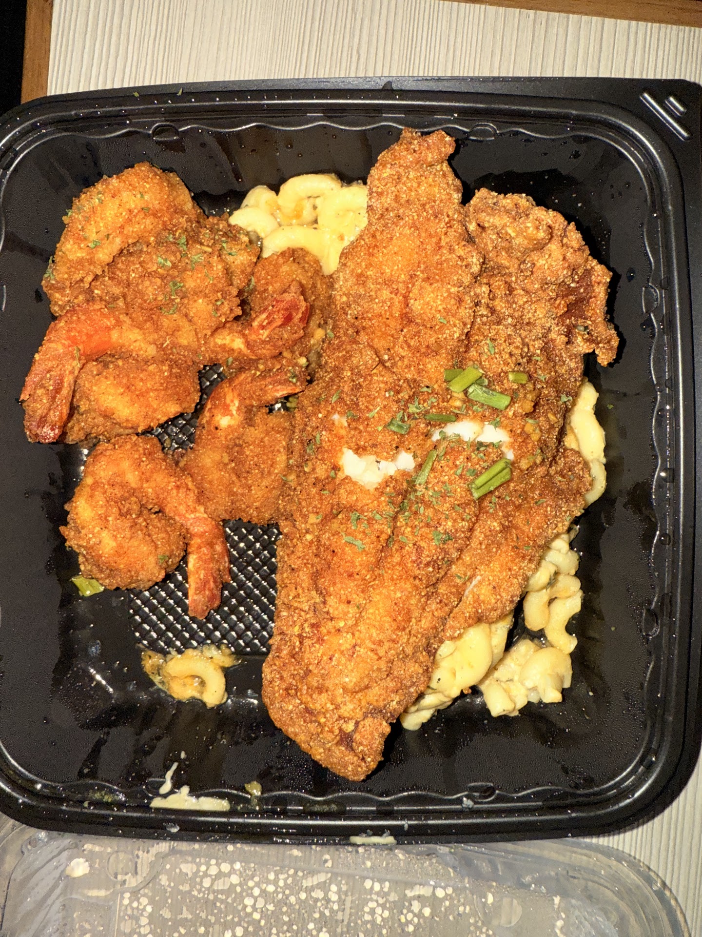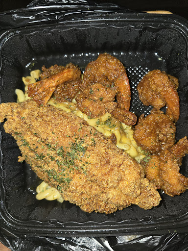Picture this: two generous portions of catfish, perfectly fried to golden-brown perfection with mac-n-cheese in the middle, and six large 🍤 bursting with flavor that danced on my taste buds🤤🤤. Every bite was a celebration! For just $35.00, this plate was a steal considering the sheer abundance and quality of the food.