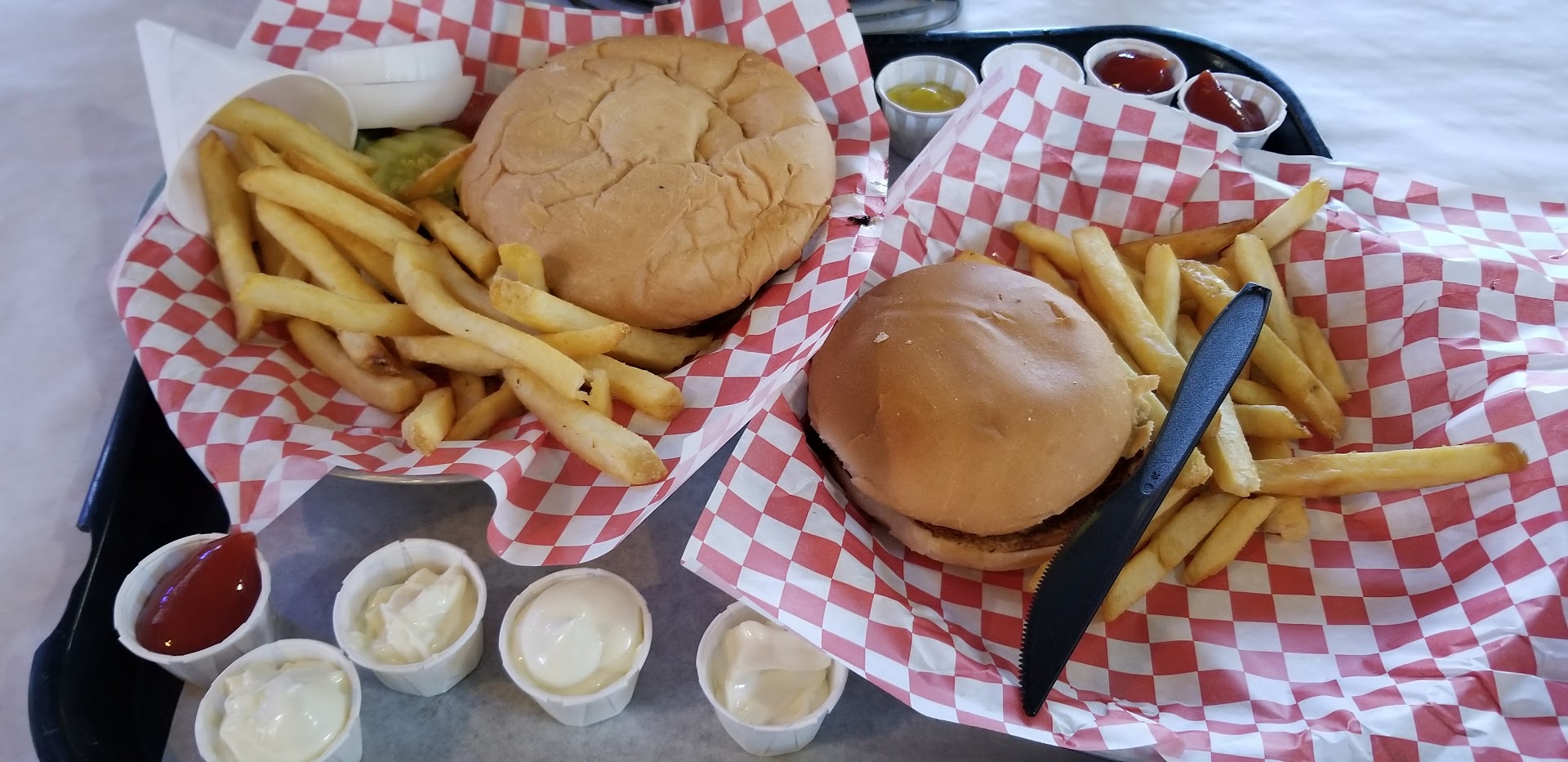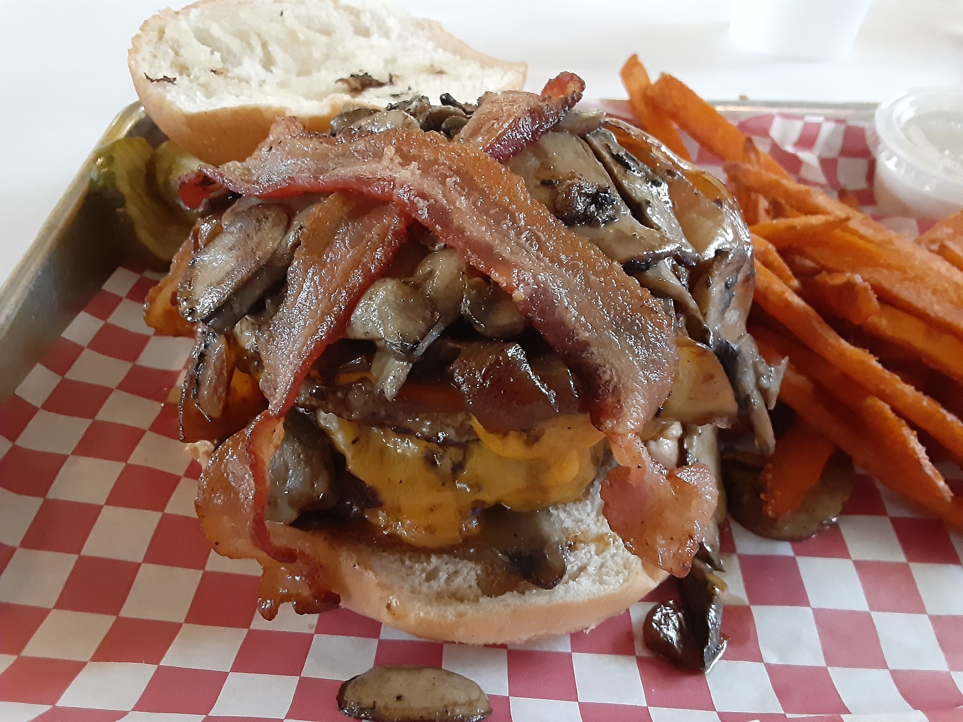 Read moreMy husband and I had been trying to get back to this place after a while because it gets so packed on the weekends, but we finally had a chance during the week to go for lunch when it was way more quiet. We used to love the burgers from here and it used to be one of our top burger spots, but unfortunately, it seems the quality has gone down. My husband got a cheeseburger and I got a beyond burger and both were extremely dry. His meat was way overcooked and hard, and my patty was undercooked and slightly cold in the middle. I was also a little annoyed that they don't give you a heads up on the menu, or even just tell you that the buns on the beyond burger are wheat. I eat regular burgers too, but sometimes I just prefer the taste of the "meatless" patty. Just because I want a meatless patty doesn't mean I want a wheat bun - that thing was soooo dry! The onions at the "toppings bar" were also extremely dried out and shriveled like they had been there for a couple of days. The fries were also super salty. The young lady helping to bus the tables also kept trying to take our trays when we repeatedly said we weren't done. I understand she was just trying to help, but it was somewhat bothersome. My husband was so dissatisfied with the meal that we ended up going to HEB a couple of hours later and grabbing some sushi, and even that went down much better. Overall, It was a pretty disappointing experience and I don't think we'll be returning...