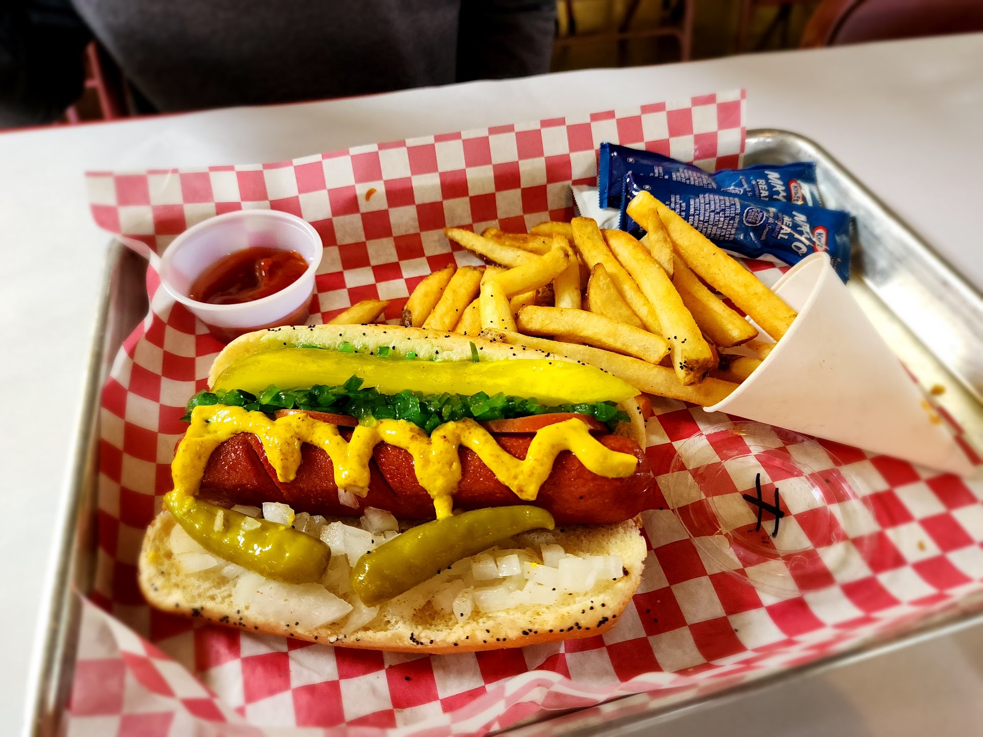 Read moreStood in line to order food for 40 minutes. Waited 40 minutes in line to get it. We had four burgers. Our team met at 6 with a plan to gather and leave at 7:30. So we got our food at 7:20 after a 6 pm arrival. While the food tasted good, it was clear they need better prep practices and to handle the high volume of customers. They were fulfilling dozens of online orders. One of our team members found if they ordered online they'd be served 20 minutes later with there to go while everyone else made the wait for order and pick up. The other thing I noticed was half finished in restaurant orders sitting out for 20 minutes while they would stop mid order to fulfill a pick up order. Flies were all over the waiting food. I'm frankly shocked that no one has gotten sick from this or some of the other prep practices like the food prep people not wearing gloves to handle the food. Several put on gloves to move food then would touch the public counter absent-mindedly before going back to prep the food. While our food did taste good when we finally got it, it left me feeling really nervous and not likely to return. That and the super overcrowdedness just weren't great.