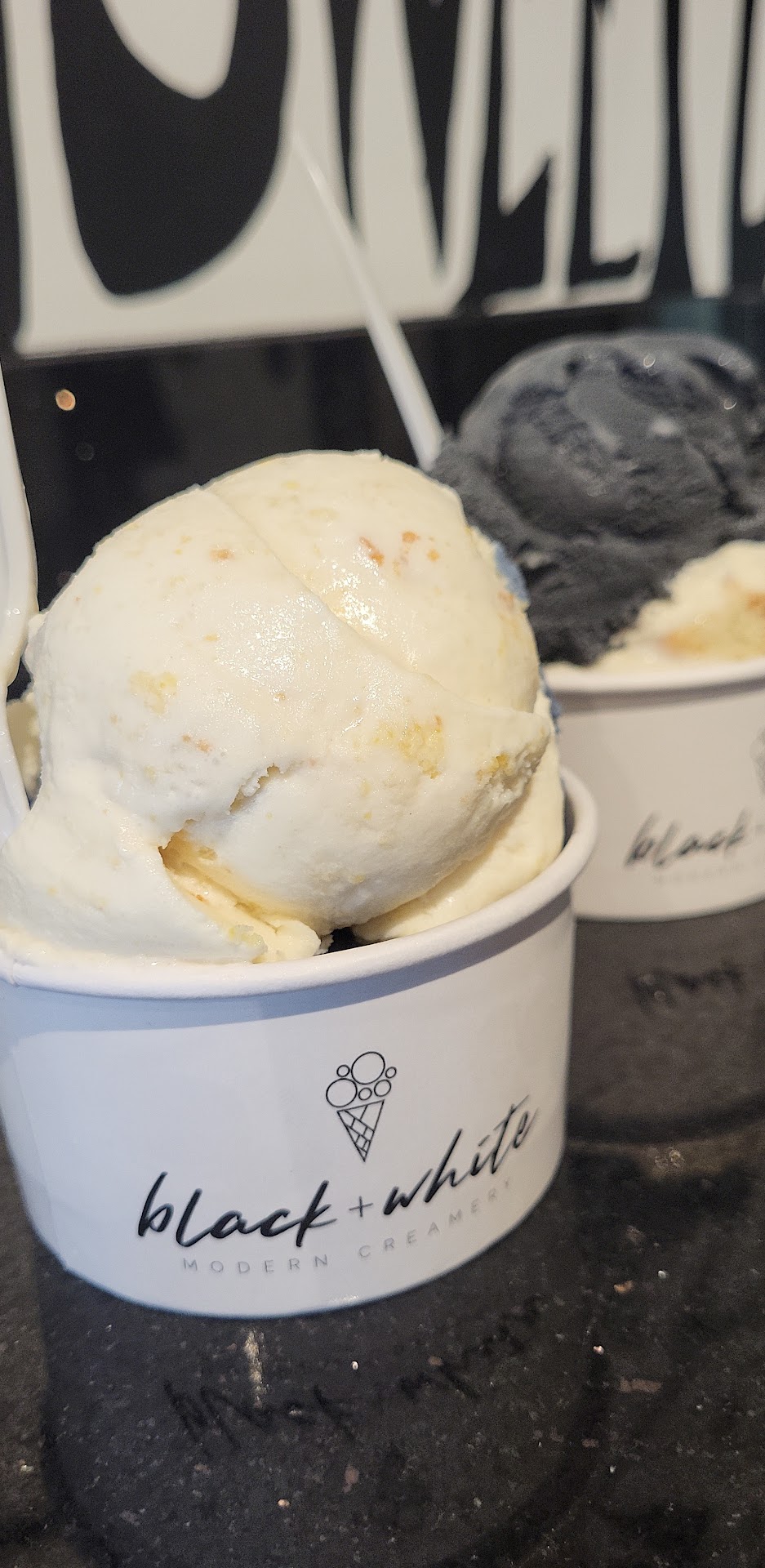 Read moreCreamiest + tastiest ice cream! A little difficult to find because the directions sent us down the side of the shopping center, but it’s right up front. We were greeted & the gentleman was very friendly. He told us to feel free to try as many as we wanted, that was very unexpected & his friendliness was comforting. A must try is the Black Vanilla, the color can be a bit jarring but the taste is heavenly. Honey Cornbread is another unexpectedly delicious flavor. Banana 🍌Pudding was delightful with a light perfect balance of banana flavor. Even the Strawberry🍓 taste was more enjoyable here compared to other shops. The ingredients tasted real, like real food or fruit was used to make the ice cream. We decided to get two 🍨 two-scoop cones. We saw the regular cones & then saw a few black ones that just looked interesting. We had to get the black cones especially since the shop is called Black+White! You have to try...