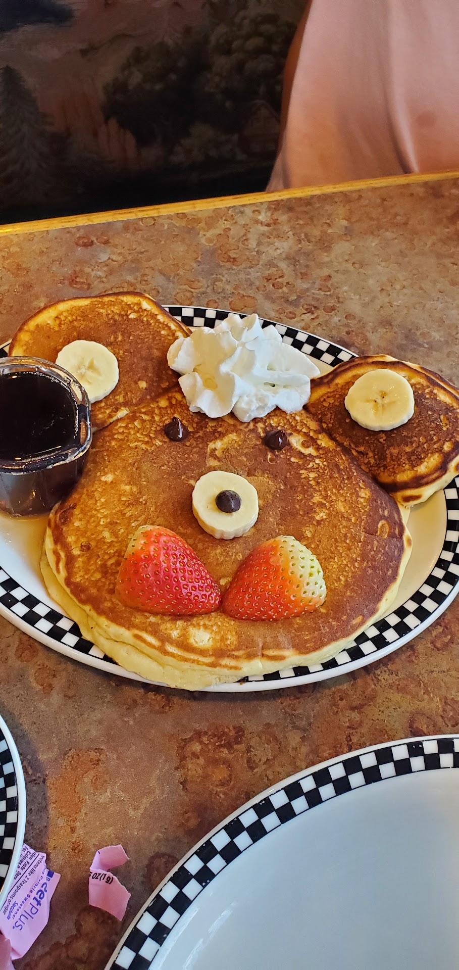 We both ordered a version of the Bear's Choice. I had: Scrambled eggs add cheese, bacon, waffle and a biscuit Husband had: Over easy eggs, bacon, sweet cream pancakes and a biscuit.