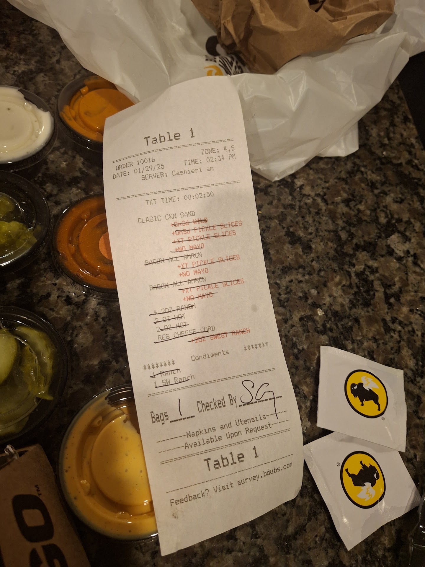 To recap: ordered on app around 8:00, it said the order would be ready at 8:30, got to store and paid at 8:25, order still hadn't been fired. If you look on the receipt, they either only fired the wings at 8:48 or that's when it was completed and we had to wait on my potato wedges for 12 min.