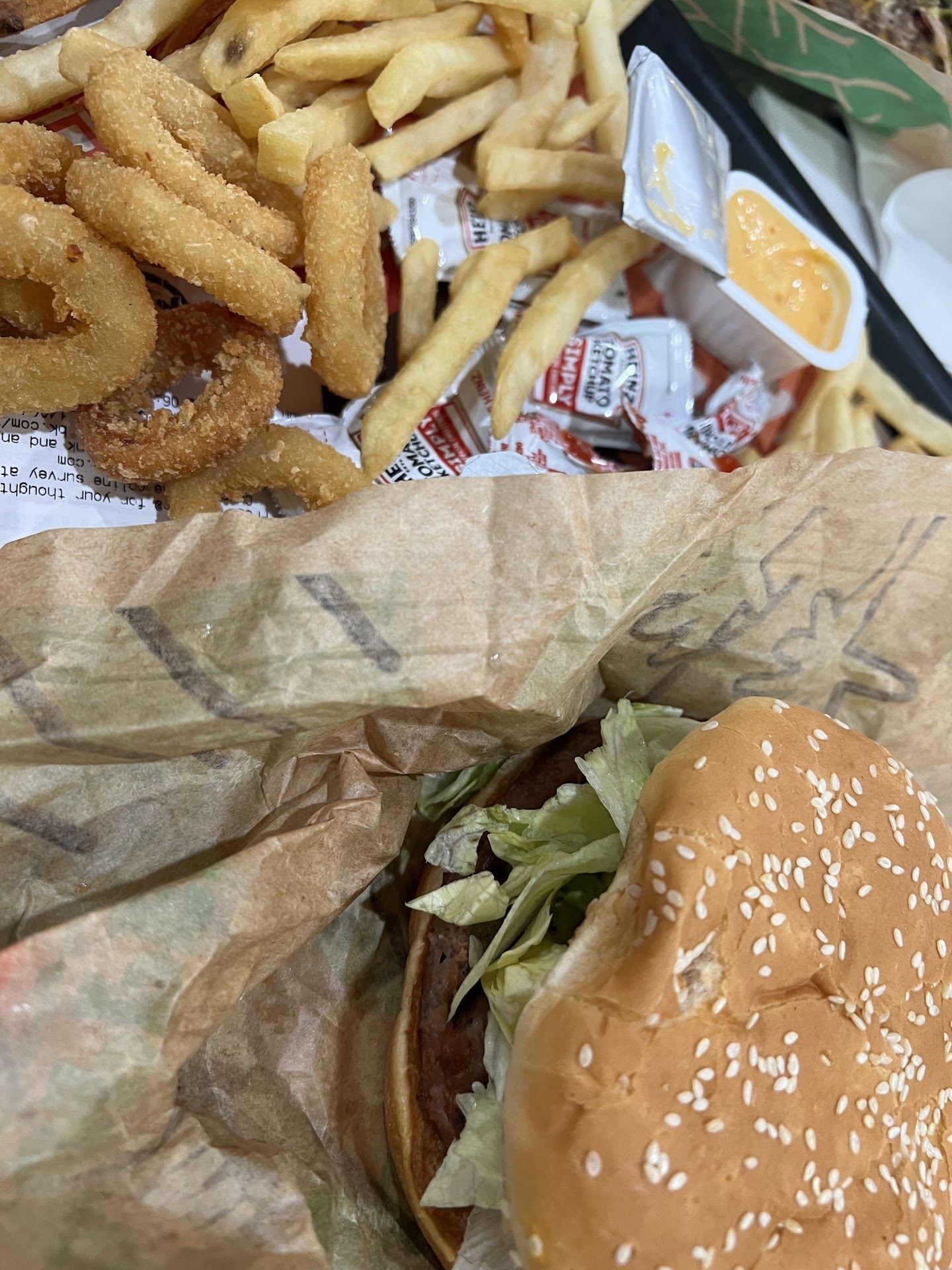 Ā Ā Ā Read moreApparently the mybkexperience website is always erroring so you can't leave a survey there. Just wanted to share that. Anyways. This was at store 9061... After a long week at the ER, it's like 9:30pm; I decided I wanted some chicken fries. BK commercials had been blasting in my face all day. Price ain't bad.. I pull up - only 4 cars in the drivethru? Great. No one inside but 2 employees sitting at the booths on their phone. I don't really care about phones at work WHEN it doesnt affect business... Ordered 1 impossible whopper for my spouse and chicken fries for me. Got told to park around the side cause they're dropping the chicken fries fresh. Cool... get my order. Head back to the hospital to be with my S/O... they haven't been eating well, so I hope this helps... Not only did I not get chicken fries after that wait, but the nuggets I got were cold.. The burger only had toppings on 1/3 of it. One. Third... I know things get busy, and maybe understaffing happened (benefit of a doubt), but like. Ow. I'm already having a horrific week and this just extra sucks. BK is so out of the way for me, and I went out of my way to go there...was feeling nostalgic for it. Wanted those dang chicken fries. Paid for more than I got since nuggets cost less... Guess I won't be...