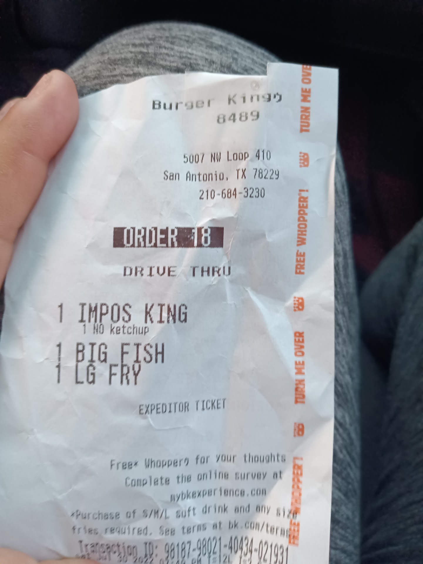 Read moreI went to your franchise location at 5007 NW Loop 410, San Antonio, TX 78229 on 7/19 at approximately 12:25 pm. I sat in your drive-thru line at the intercom for over 10 minutes and no one came on to take my order. I then pulled around to the window and was greeted by a male employee who asked what I had ordered. When I informed him that I had not ordered yet as no one came over the intercom to take my order. He just said "oh". I asked if I could order now. He replied with wait a minute and let me see. The employee then disappeared for a few more minutes into the back of the restaurant to talk to the manager. Next thing I know the employee is back up front with the manager. The manager is on the front line actively eating a chocolate chip cookie while wearing her food serving gloves. It was at this point, that I waved at them through the window to let them know that they had now wasted approximately 20 minutes of my limited lunch hour, I still had not ordered, and would not be ordering based on the service that I had already received and the disgusting situation that I just saw from the manager. This situation needs to be addressed immediately. Please alert whomever you need to and the owner of the franchise. I have worked food service before and the Health Department would have a heyday with what I witnessed...