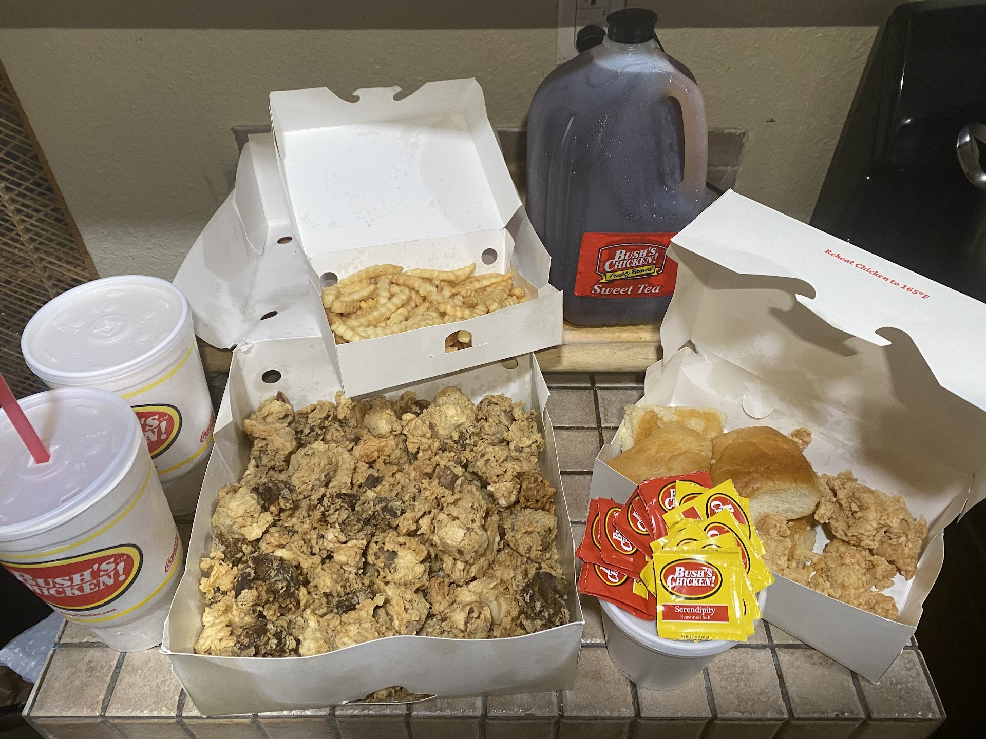 Read moreWe waited in line for 30 minutes. Itâs Friday; we get it. When we finally arrived, they didnât have enough chicken for the 15 piece we ordered. They asked us if we were willing to wait 15 minutes to get fresh chicken. The wait time ended up being 45 minutes. They didnât give us our gallon of tea we ordered, so I began to call to assure they knew but got no answer. The chicken was bland. The okra was bland. Iâm honestly surprised because this isnât the standard of any Bushâs Chicken. Chicken is usually tasty and enjoyable. We ordered at 9:18, ticket #463, and I know we werenât the last ones, so, I truly believe they rushed so much they forgot to season it. It was tasteless, and my family, well, we donât do insipid food!! I love Bushâs Chicken, and I honestly hope they get it together. And, yes, hopefully tomorrow I will drive by there and pick up my delicious gallon of tea and bring my receipt. Iâll have proof I called three times to communicate, and let it ring but got no answer on my phone. Maybe they were still so busy and trying their best to move the line to close, but tasteless chicken??? You made us wait 45 minutes after a long line of 30 minute wait, and you forget to check the order to assure we get our tea? No taste in the chicken and okra! No sweet tea to pass the tasteless chicken! Long wait! This specific visit is definitely a...