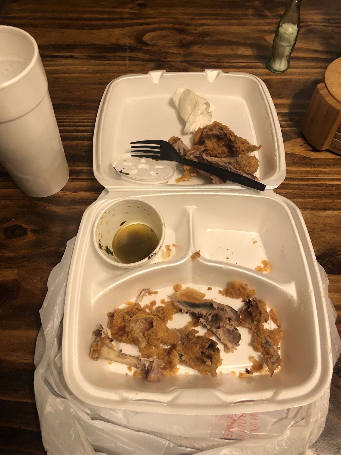 We were greeted warmly and when the gentleman working the register heard this was our first time there, he offered me a sample of their fried pork riblets. There are probably well over a dozen establishments that offer fried chicken but NONE of them have the riblets that Eddie has so masterfully transformed into such a succulent creation! (I only had one but it made that much of an impact!) As a matter of fact, I've never had riblets even remotely like his!