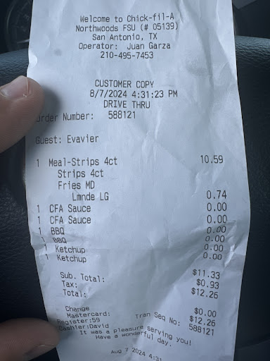Ā Ā Ā Read moreCame to this location for the first time. Accidentally got in mobile order line (most CFAs have two drive through lines.) Three workers were standing talking and did not acknowledge me. When the worker David finally came up to me I explained that i accidentally got in the wrong line and if he could still take my order. Mind you, no cars were even in line to place an order. He refused and told me that I had to go around. I asked why and he said that the manager told them so. I had to wait in line for over 5 mins for the cars in front of me to get their food so I can go around. Spoke to a gentleman at the window and he was very polite and offered me water while he grabbed a manager. The manager never came. Went around and reordered in the proper line. The gentleman told me that he will send the manager my way. The manager was walking around the drive thru and never came to me. More than likely will not come back to this...