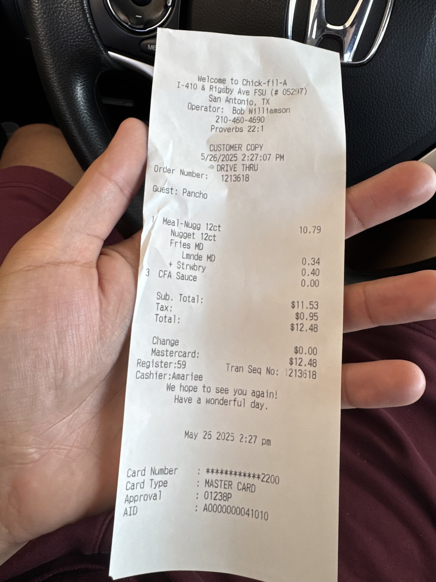 Read moreNever thought in my life I would give a Chick-fil-A a one star rating but here it goes. First and last time coming to this location! I picked up breakfast through mobile order that myself and my kids ordered. My daughters and I were able to receive our order, but when I tried scan my son order, it took us through the whole process and it said speak to a team member at the end. I spoke to a team member and she was very nice (that's why I gave the one star because we can't give 0) and she said couldn't find the order. My issue is if the rest of us order was ready and they were all ordered the same time, where was his?! It was ordered within the window! After waiting for about 10-15, a manager came out and didn't do much but say sorry and explain that it was more likely canceled because it wasn't in the window, even though I showed him it was ordered at 10:15am. I drove out my way to get these kids their Chick-fil-A breakfast since they were home from school...our regular location would've never handled this situation like this, ESPECIALLY after I showed it was ordered in the breakfast window! Just doesn't make any sense that the rest of us were able to get our order, but my son had to be the only...