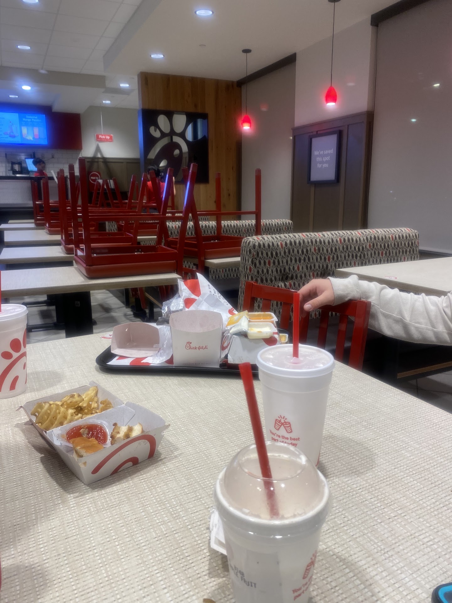 Read moreHorrible customer service. We arrived to get a quick dinner after my sonâs basketball game it was exactly at 8:33pm . Yes I am aware that lobby closes at 9pm but to be approach by the manager or whoever she was to tell us that they close loobby at 9 oâclock and that we only have till 9 oâclock to eat and they would give us bags to go if we didnât finish our food. I get it the staff wants go home there tired but from my understanding you do not kick anybody out of your lobby and offer them bags to go if they donât finish their food. Since when has this become a rule at Chick-fil-A . We did what they asked us we rushed and finished our food didnât even get to enjoy it . Went back to the front counter to ask for a refill on our drinks I asked her what was her name she told me her name was Zoe . When I told her that what she did was wrong she got upset change the story around and said oh we could let you stay longer if you wanted. I told her no thank you We didnât enjoy our dinner we weâre rushed . She didnât like the fact that I told her you never kick out your customers or rush them out I run a restaurant myself I donât do that to anyone of my customers . She got upset filled up my drink put it on the counter it kind of spills walks away pushes the back door to the kitchen and walks off pissed off great job Chick-fil-A . What kind of employees do you have working there or people in...