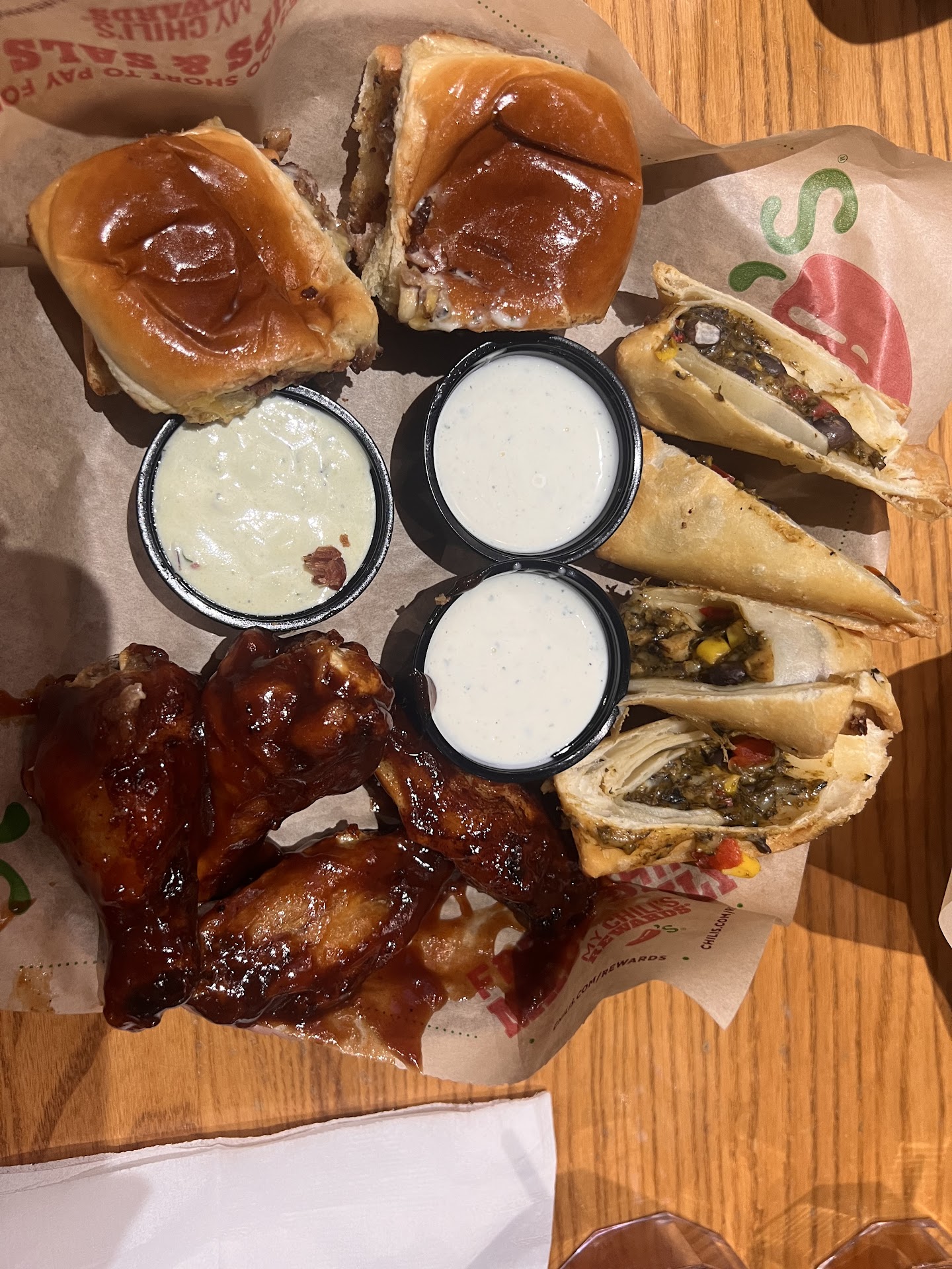 My husband ordered off the app and sent me to the wrong chilli's location... Apparently that's pretty normal because the wonderful woman at the to-go checkout counter was super sweet and told me that there are 3 locations all down 281 that are really close to one another... I then had to leave that location, and go to this one... When I arrived, it was about 15-20 mins before they closed, but there wasn't a single car in the parking lot and it looked dead... Honestly, it really looked like they had already closed when I arrived! The to-go entrance was locked, but the normal front entrance was unlocked and I was able to go inside... The entrance of this location is completely Bazar! It's like the building was built too close to the access road, because there's no way to drive in front of the building... Most locations I've been to, the building is set further back from the road so that people can drive by the front door and drop people off and whatnot... This one had a long narrow paved sidewalk to take you up to the entrance... Totally weird... Anyways, I got inside and noticed that there wasn't a single customer in the building other than myself... All the employees where cleaning this and that and no one other than the bartender even noticed my existence... I had to wait a couple more mins for the food to come out and the bartender and another server that came over to keep me company were super nice! They seemed like awesome people, just a very slow restaurant location... Anyways, the food came out and I took it home... So we spent about $80 on food for 2 people, my husband and I... We ordered brisket, ribs 3 different ways, BBQ chicken, saladas, some sides and the chocolate lava cake thingy... Honestly, we were so let down by the food we ordered... When we ordered it, the descriptions made our mouths water, but in reality everything tasted like day old, over sauced, leftovers or something... For example the brisket looked like a pulled pork soup or something! It was completely shredded, mostly just bark, and swimming in so much sauce that it could have passed as soup at first glance... All of it except for the fries, salads, and corn on the cob was inedible! It looked they had started cleaning up thr kitchen early that day and then my order came in... Instead of making all new food and dirtying up the kitchen again, they choose to give us food that was about to be thrown out... Seriously disappointed and grossed out about spending $80 for food that should have been in the garbage... The only reason that I gave 2 stars was because the bartender and server were...