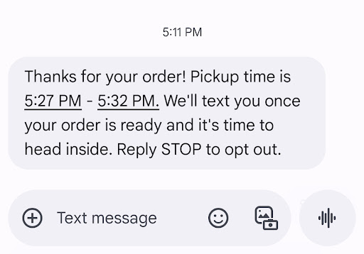 I ordered online (08/02 at 2:22pm) for my family and I to have a quick convenient meal. It said that I would receive a text message when the order was ready, but I didn't receive one. Luckily I live around the corner, and was able to get there.