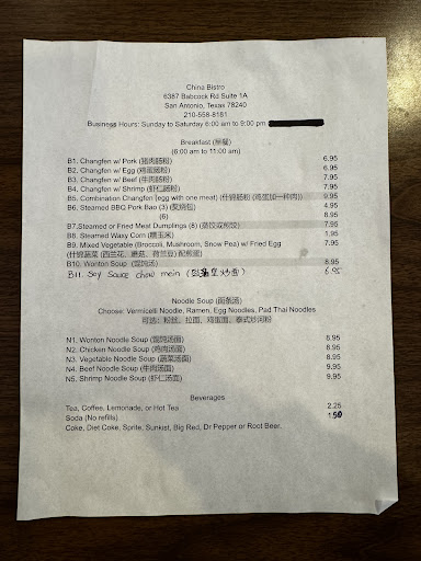 Read moreChina Bistro has been a quick and easy place for me to grab dinner when I havenât felt like cooking, so imagine how excited I was to see that they are now open for breakfast! From 6-11 daily, they offer their Chinese breakfast and let me tell you - it is DELICIOUS! I went two mornings in a row because there was just so much I wanted to try. Morning 1: Pork Changfen and Pork Bao. Wow! The Changfen was very clean tasting, and by that I mean very minimal seasoning so the natural flavors shone through. The bao were huge, fresh, and the filling is savory and perfect for breakfast. Morning 2: Beef noodle soup and pan fried dumplings. The previous days breakfast was fresh on my mind but I decided to try something new and neither dish disappoints. The soup is seasoned to perfection and the beef is tender and nearly a melt-in-your-mouth experience. The dumplings are crispy and have an amazing filling just like the bao. There is an option to get the dumplings steamed but I chose pan fried to complement the soup I was going to have.