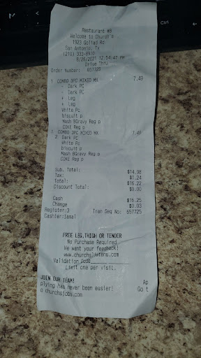 Read moreThis was a very frustrating experience. Worst customer service I've ever had from any restaurant. I had placed an order online ahead of time for a specific time pick up. In the website it charges for the order before it's picked up. Unlike any other restaurant online ordering service besides a pizza place. When i arrived at 8:45 pm which was well ahead of their closing time of 10pm. They stated were already closed. I mentioned the closing time and he said he decided to close early because an employee did not show. Even though there were other employees still working at the restaurant. I told him i had placed an online order ahead of time and i was there to pick that up and he stated they never received it. I then showed him my confirmation. He said they wouldn't charge until i picked it up and since they didn't get it i wouldn't be charged. I then showed him my bank account where i had been charged. He then stated that they don't even think they have online capabilities. I then showed him it was this location the order was placed. I ask him for a solution and he said contact Church's ordering which has no number. I asked for a customer service number and he said there wasn't one. I now have to get a charge back through my bank for the meal never received. I will never go to...