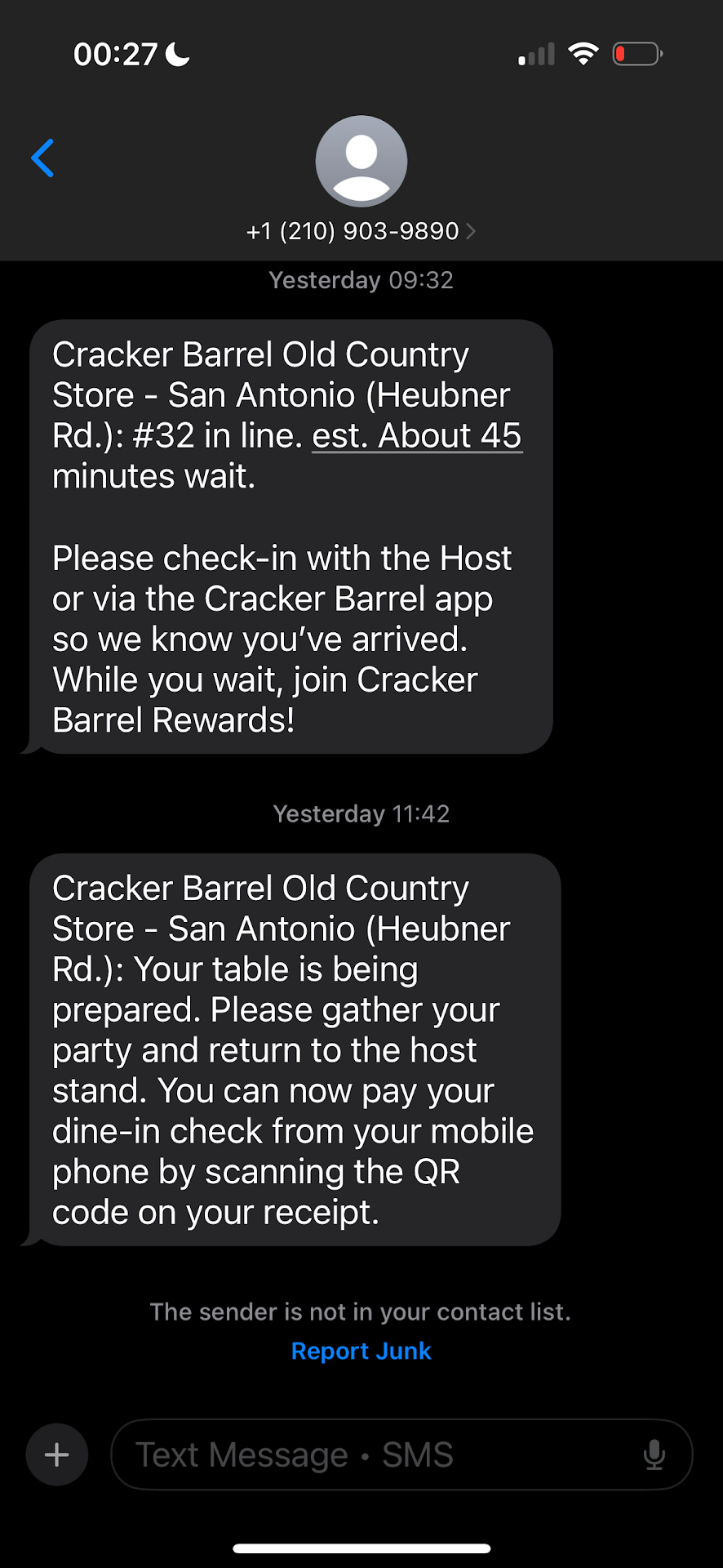 Ā Ā Ā Read moreMe and my daughter had made it a tradition of going to Cracker Barrel when we travel and today we came to this location, I have visit another Cracker Barrel in San Antonio because we travel here often so we like trying different ones. The wait wasnāt bad because I sign us up online, the server for the first time in a long time got to me, no eye contact, no smiles hardly wanted to greet us, Iām the one that said good morning,how are you doing?. She kept looking at her little notebook,I understand you guys are overwhelmed but thatās not the customers fault, you are not feeling well ask for help tell your manager that you need a breather I donāt have to flag you down.I had ask for biscuits,I donāt care if youāre going to charge me I want biscuits with my coffee so of course I waited also for my coffee refill and after asking another waited next to our section for biscuits which he never brought and I know he isnāt my server but isnāt team work part of the job ?.I get my food I asked that person at this time already mad who do I talk to about changing servers because she hasnāt been to my table at all by this time, he said no worries I will help you what do you need and I told him all I needed he brought it and finally was done eating go to the register told the lady I wanted to tip this guy who served me because the waitress didnāt serve me she was like ok yeah ok. At this point I told her I know you donāt care so I wonāt say nothing anymore,a manager had to come so I can tip Aston because he wasnāt a server, did he ask if everything was ok no he didnāt. I wasnāt Trying to get a free meal I just want to make it clear I had a problem and I was not the only one the table next to me also had to wave down the same server but it didnāt matter. I believe that if you want a good tip treat people with respect make them feel good about coming out to visit your restaurant,this why waiters complain about not being tipped but they donāt see how they are serving us so poorly and expect a tip smh. I tipped the guy Ashton for taking care of us thank you very much for serving us and my waitress just came back to drop the check not once did she ask is your meal ok? need anything? So she got a...
