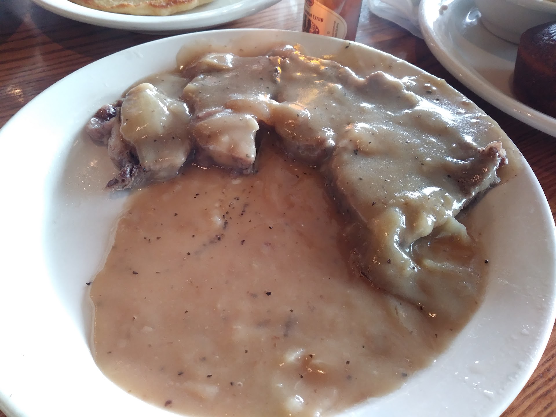 The country fried steak is “meh.” I’m pretty sure that they microwaved it, too. There is no crisp to the batter.