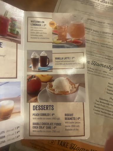 2018 (5 Star) My 1st time to a Cracker Barrel , Kept seeing Commercials on tv Turkey fried steak Style Plate Looked Yummy. But I Got - The Chicken fried Steak it was a 10 ! Omg it was scrumchishes ! NOT Over Breaded the Steak was Thick and GOOD portion. And 3 SIDES!!!! I was SHOCKED but I Like Mac and Cheese but every one doesn't make it Good but I Took the Chance ! Got DOUBLE Mac yes I'm a Fatty đ€Łđ€Łđ€Łđ And Fries. The Frys I'll give them a 7 they where kinda Cold and chewy like they where done before what ever they where waiting for .... And some frys had potato skin I actually don't like the skin on potatoes but I lathered each 1 with the Gravy it was edable đ & Double Mac (F.Y.I) NEXT Time will be TRIPLE Mac it was to DIE FOR !!! If I could Give You 10 STARS For that Mac I would ! It was SO Tasty, Creamy,Perfect amount of Cheesyness ! You MUST Try that at the Very LEAST ! Sweet Tea was Perfect NOT Over sweet I personally think the Sweetness was good enough tea I give the tea 7 1/2 Taste. FREE Biscuits and Corn Bread , Budda & Jelly. Biscuits where not warm But then Again we came in about 45min before closing . But they did taste Home made Nice and Fluffy I give them a 9 , 10 if warm.. Okay the Corn BREAD was Not like a corn bread I make from those 2 for $1 sweet Corn Breads . Cracker Barrel corn bread taste so Good down to a science đ€Łđ€ I Loved them Nice Tasty Crust on outside but yummy tasty inside I Give them a 10 Not warm Still GOOD . But my wife Gives Biscuits 10 and corn muffins 9. Customer service 10 for sure from entering down to the waiter . & The Gift Store Great Prices !!! Beautiful unique Gifts . I will be doing my Christmas ...