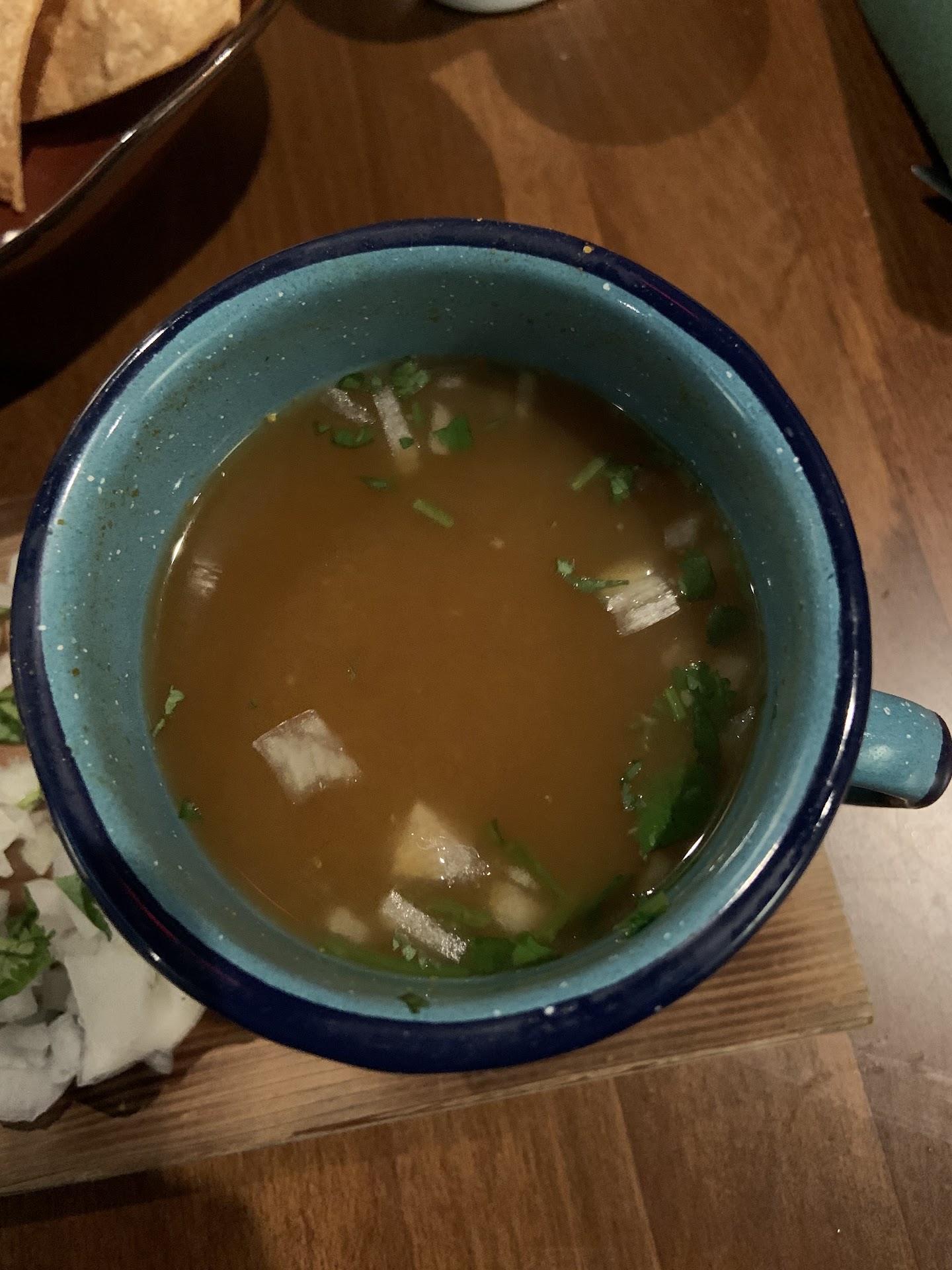 I was very impressed by the camaron soup sample, so I decided to order the actual dish, which was supposed to include potatoes and carrots per the description. It also comes with a side of cilantro and onion. I asked for an order of grilled shrimp with it. Well, when the soup came out there were neither potatoes nor carrots in it. It was very quickly dropped off so I couldn’t say anything after noticing such. Our waiter never came back either while we were eating our entrees so I couldn’t mention it to him. I will say the grilled shrimp was amazing, perfectly seasoned and they were very fresh. The broth itself is phenomenal, as I love spicy food. It had just the right amount of kick and was very flavorful. What I can’t excuse though is presenting an incomplete dish. Not only is this a mistake on the kitchen that shouldn’t have been overlooked, but then the person serving the dish as well. I used to be a server in a high-end restaurant and you need to always make sure dishes look as they should and are as ordered. I don’t recall ever saying no potatoes or carrots.