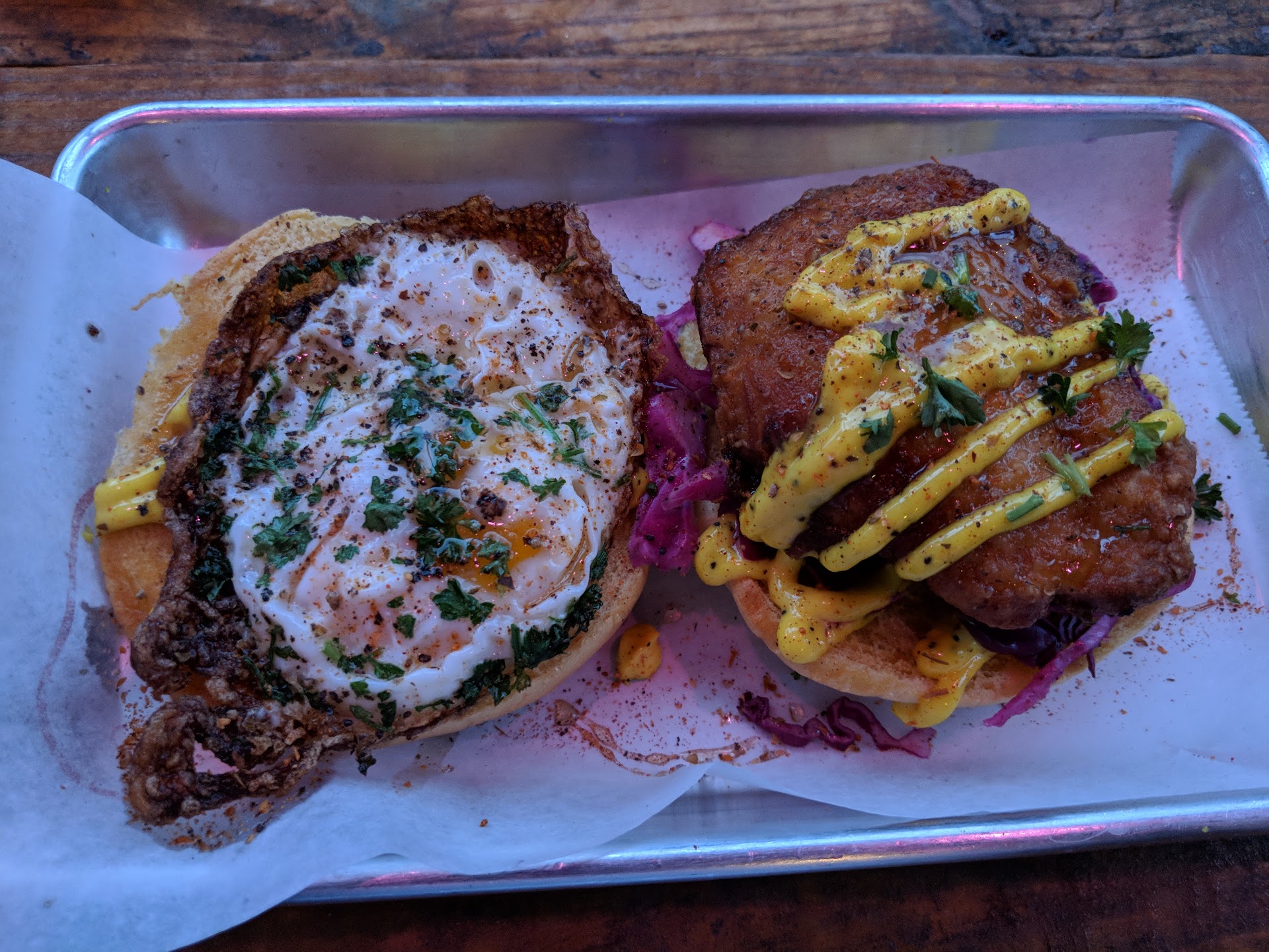 We sat for about 10-15 minutes and then our food arrived. Not sure if the food is always this prompt but I'm a fan of that. Everything looked delicious! I wish I could say that same about the taste. The "cheese" fries contain zero dairy. It's mostly blended veggies (carrots?) and spices that make a cheese consistency. I ordered them on a whim and to "try something new" and I'm probably never going to order them again. The chicken sandwich has a fried egg, a fried chicken thigh, and slaw drizzled with mustard. The chicken was very juicy, the sandwich is just messy to eat. The wings are nothing to write home about. I've had better at so many other places. In my opinion, they lacked flavor and were a little dry. Plus, what good are wings when you can't have ranch. I guess you could have ranch if you want to spend another $5 on the $40 you're already spending.