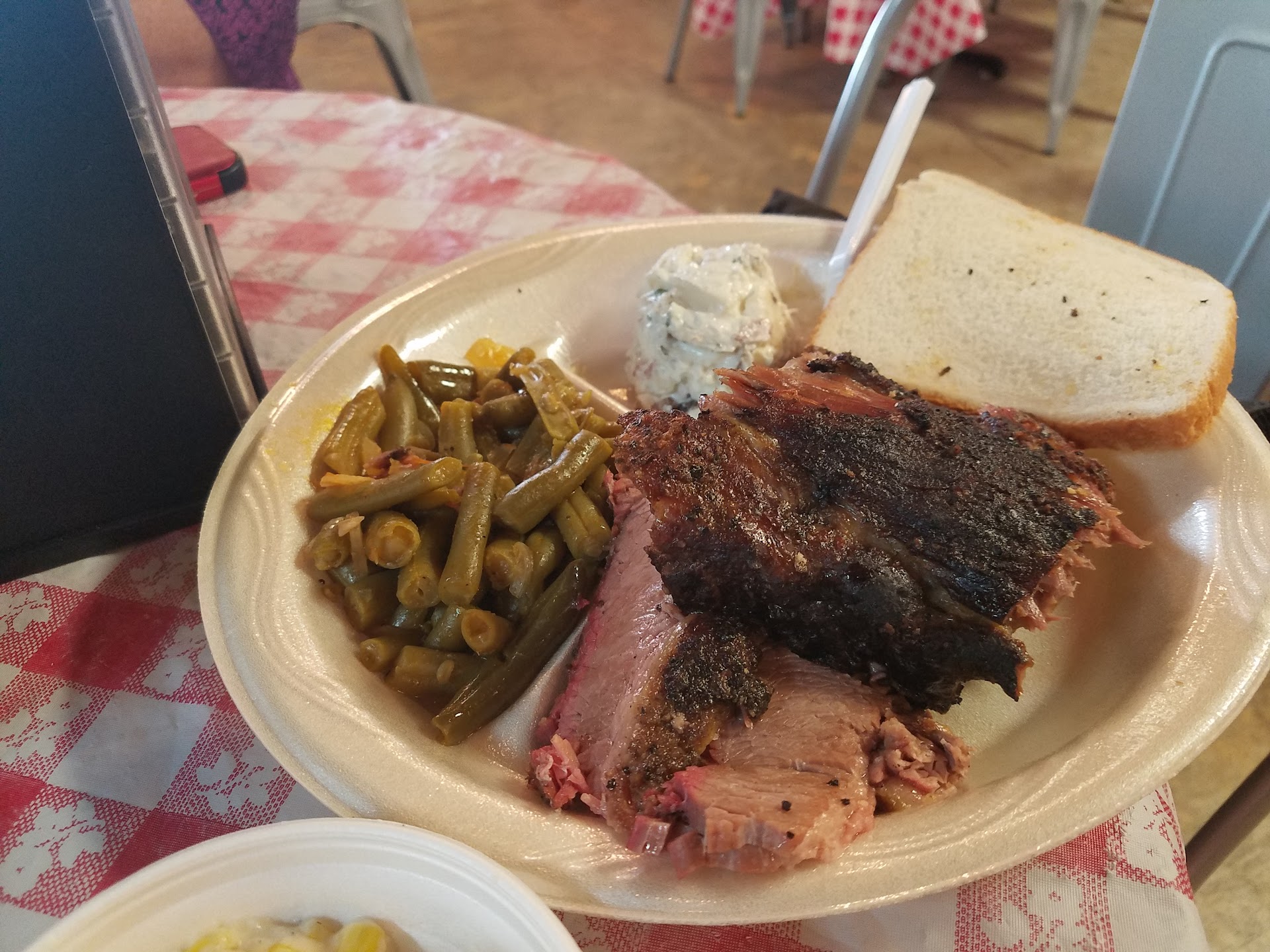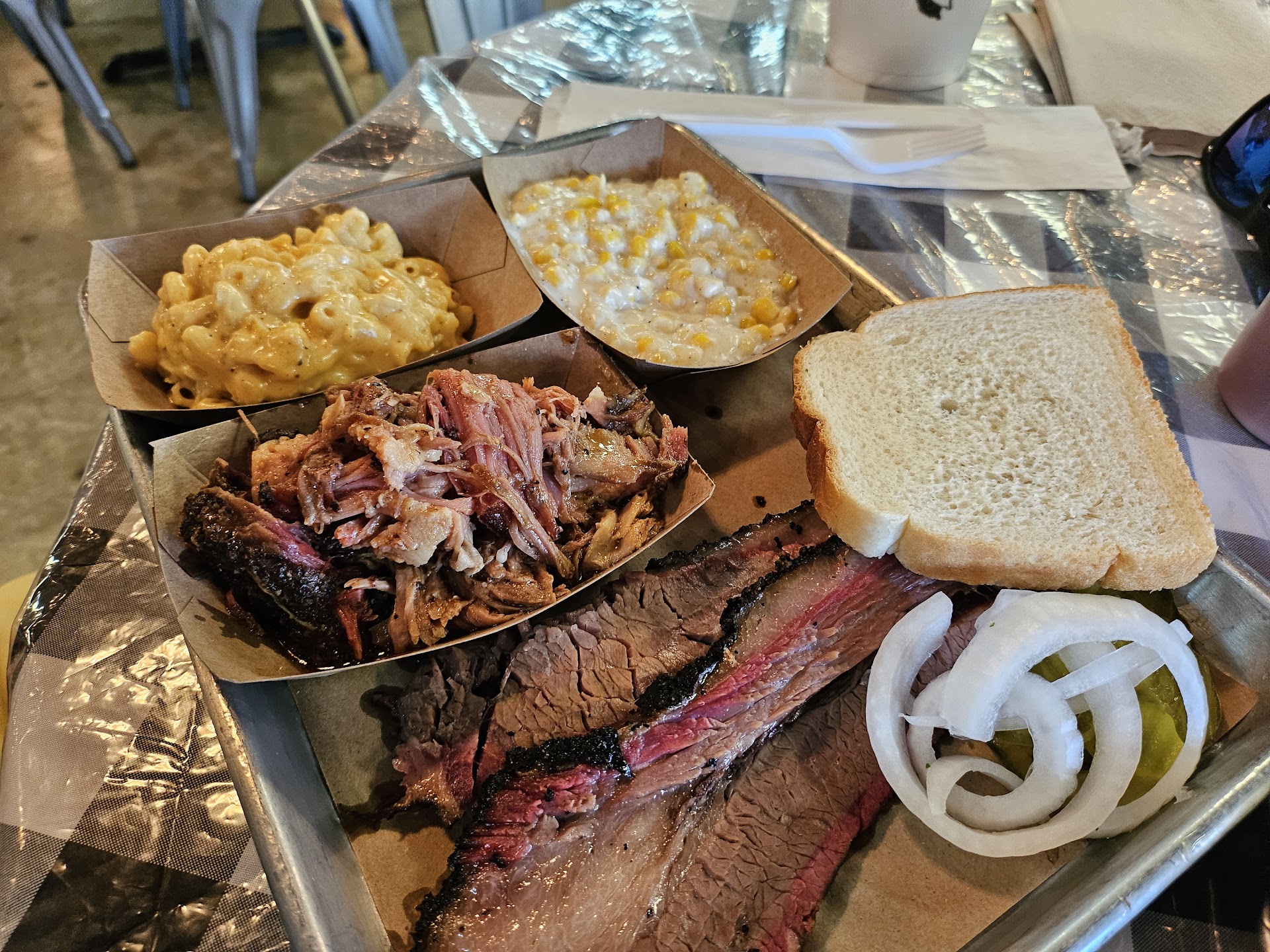 My son and I ordered the 3 meat plates. Mine was brisket, pulled pork, spare ribs, cream corn and beans. My son got brisket, pulled pork, sausage, cream corn and beans. We shared, he got one of my ribs and I got have his sausage.