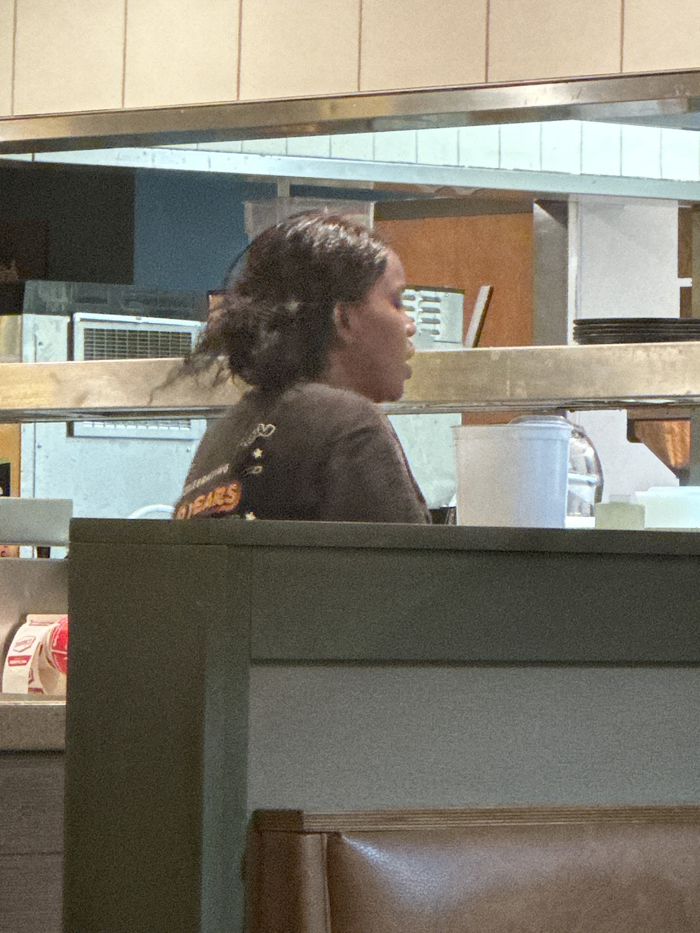We came in to eat about 1 in the morning thinking we could eat and not worry about having to wait on getting a table or service. No waiting to get in was a good start. Our server handed us our menu and asked for our drink order and left. We waited over ten minutes for her to come back. She dropped off our drinks with no straws and minus one drink. She went to take orders from other customers and cash a customer out. She finally came back 10 minutes later with wet straws and went back to get dry ones. She finally returned with 2 plates and that was all. We didn't get salt no pepper no utensils no ketchup no pancakes no syrup no toast no nothing. She goes to talk to another individual goes and checks on other customers again. She sees me flagging her down and then tells me they had no lemons and I told her we still had no straws. She finally brings the straws but forgets the rest of the food and everything else that comes with what we ordered. So she goes back in helps others and cashes out more customers. She finally sees that my boyfriend was eating his food with a knife and finally brings utensils but by that time he was already just about done with this food. I sat there not able to eat because I didn't have everything I needed so I could start eating. By this time I was done and she kept trying to bring stuff out but it was already too late. She forgot my boyfriend's pancakes which were sitting up on the counter but at this point I told her I was done and we were ready to leave. She asked if I want to speak to the manager I just told her I wanted to leave but the manager did come and speak with me. I did not yell or scream or throw a fit but I did tell her how everything went down and she still charged us for food that he ate with a knife but she did not charge me for my meal. While everything was going on she was handling food and handling money handling dirty dishes off another table and the entire time she did not wash her hands or sanitize them one bit. I understand you are busy but you need to always stop and wash your hands...