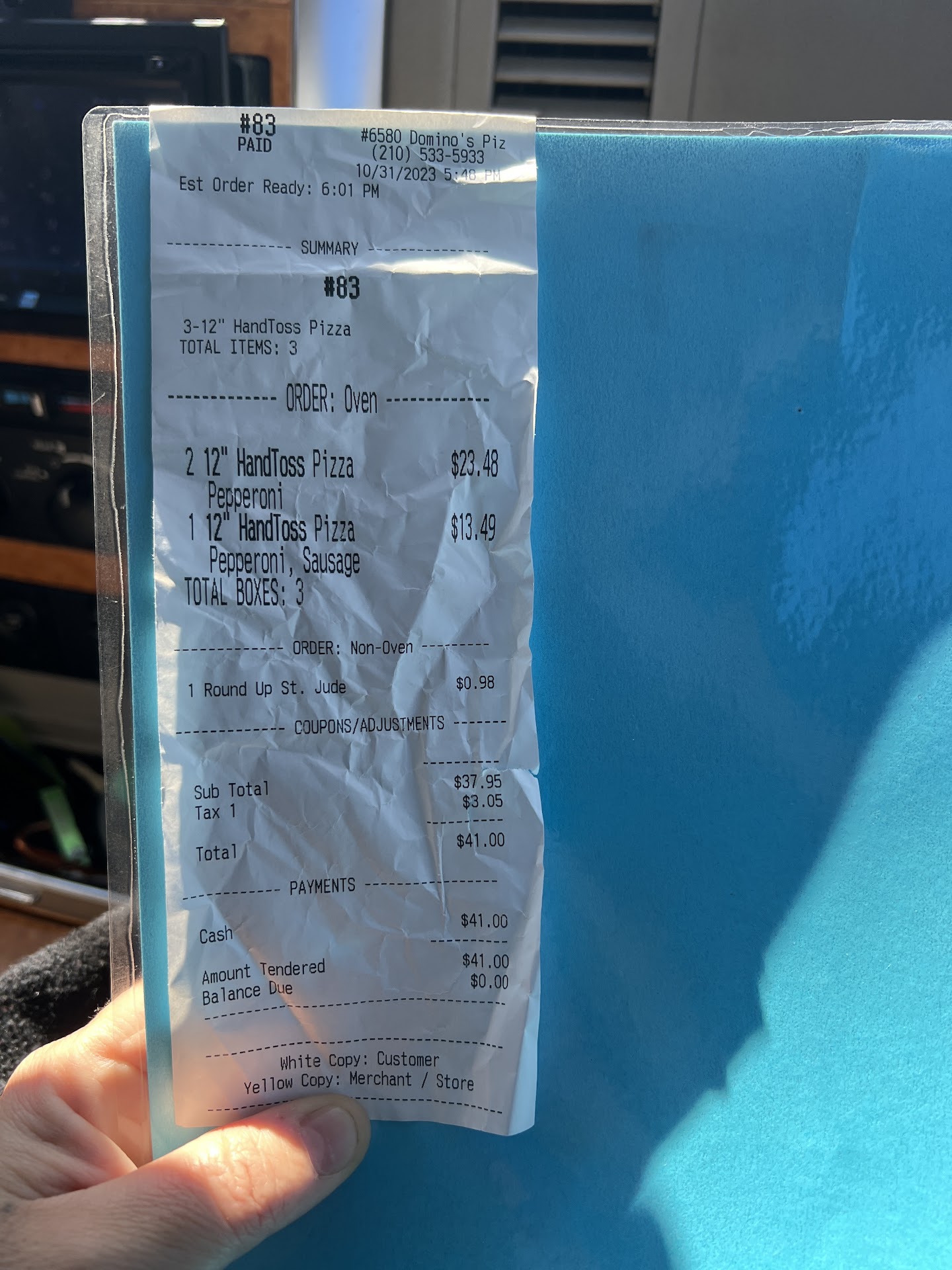 I went to the store at Goliad and Fair. I normally don't leave bad comments but this time I have to. I ordered a large pepperoni, and a large supreme, I had to wait for 15 min because I had walked in, I didn't mind. But the error was that I had to park my truck in the lot next door because the we're getting a truck order, so when the truck left , I told the woman behind the counter that I was going to move my truck over to their lot, so I walk in and the woman who took my order said your pizzas are ready, I take my pizzas get home ( I live about 17 min away ) look in the box and one of the pizzas is a large pepperoni, and the other is a cheese pizza. NOT what I had ordered, I had ordered a large pepperoni and a large supreme, so I call the store and theven woman that answered says hold on, and in the background I hear them laughing, and she comes back on line and says " oh yeah here's yours if you want to come and pick it up" ( well yeah I want to pick it up DUHHH) I take back the other pizzas, and you would have thought that they would have said it was our fault, so we're going to make your pizzas again. Nope , I'm already mad, so I just get my pizzas and leave, get home and check the pies again and one one of them is SQUARE CUT, WHO ORDERS A SQUARE CUT PIZZA? YOU CAN'T PICK UP THE CENTER PIECES BECAUSE THE BECOME SOGGY AND STICK TO THE FRIGGIN BOX!!!!! And by the time I get back home the pizza is cold. So yeah it is safe to say that I will not go back to this DOMINOS , I have five options now PAPA JOHNS, PIZZA HUT, LITTLE CESARS, PETER PIPER PIZZA, OR SAM'S PIZZA , I thinkany of these would be better than the crap I just got. Nobody at home want to eat it so it's going...