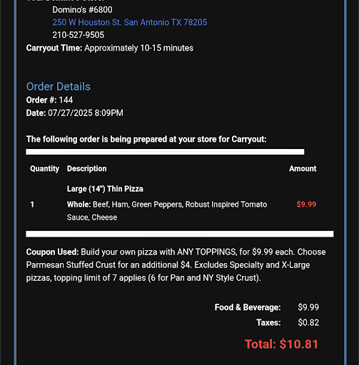 Read moreSo I accidentally ordered from this dominoes location again thinking I was ordering from somewhere else. (Last time I got food poisoning). How that happens I don't know but it did. I guess was way too hungry. Placed an order at 10:30 PM on a Saturday and it didn't leave the store till 12:30 AM. I never received the order. No text. No call. Nothing.