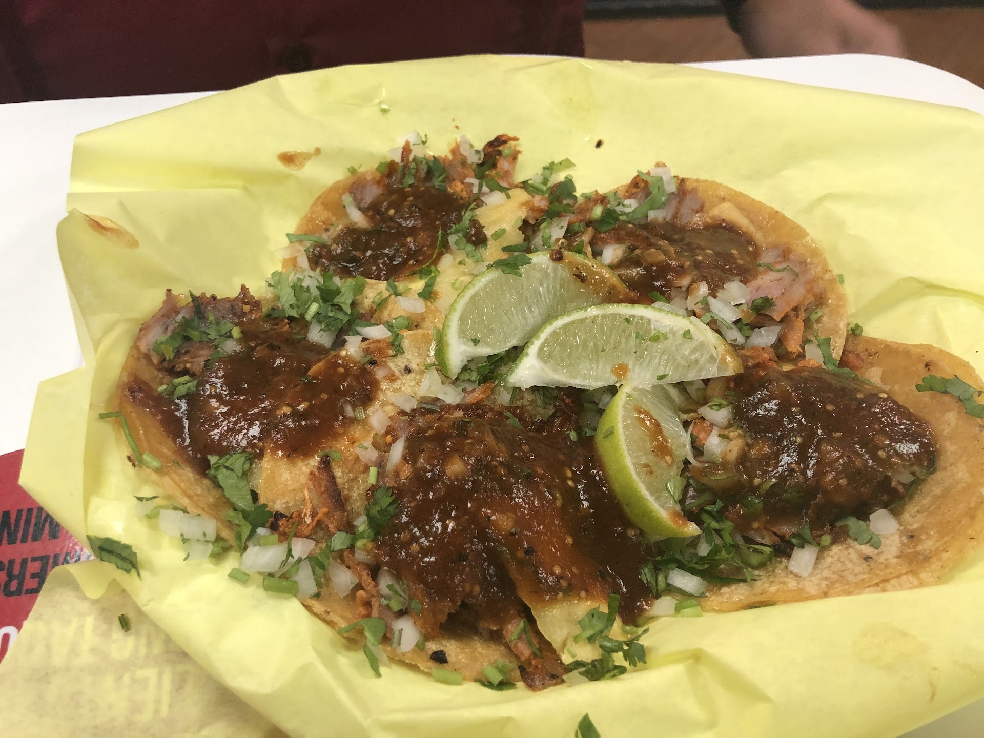 "The pastor comes straight from el trompo, none of that precut stuff. Nicely charred and plated immediately with the recommended salsas, the pastor tacos are a dream. The first time I had them I thanked God for such an amazing taco."