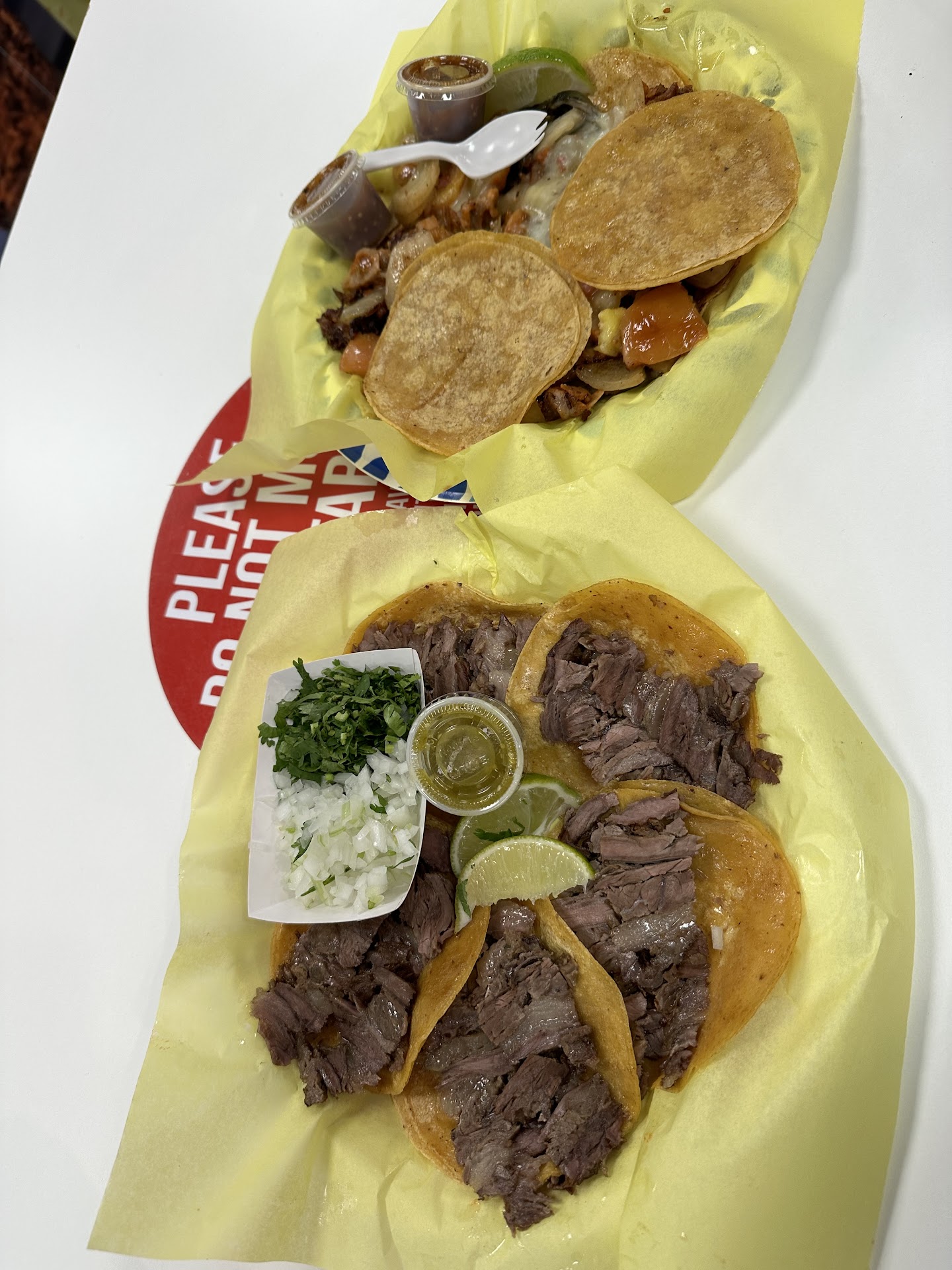 I typically don’t get Al Pastor tacos because when I do they come heavy seasoned with ground up chiles 🌶 and I get terrible heartburn. This one came out clean with no 🌶 and also not really a lot of anything but cheese. That’s really all I tasted. I did get a little poblano flavor since it’s cut up into squares and mixed in but as for the meat, ehh 🤷🏽♂️. This brings me 180 degrees from grossly over seasoned to under seasoned. The food was ok, place is very clean, very crowded and extremely limited seating. If you order to go I hope your close by so they are still hot when eat, they get kinda nasty when cold and greasy. We dined in and stood at the high top tables available. We got our food in a reasonable time but my sister and husband got theirs about 20-25 mins after we did and we got lager plates. She only ordered 3 tacos. When she got it the order was wrong. While we waited for her food we watched all of the to go orders get pushed out the door and when she asked about her plate 10mins after I got mine they said it’s being made right now. She finally got it after another 10mins.