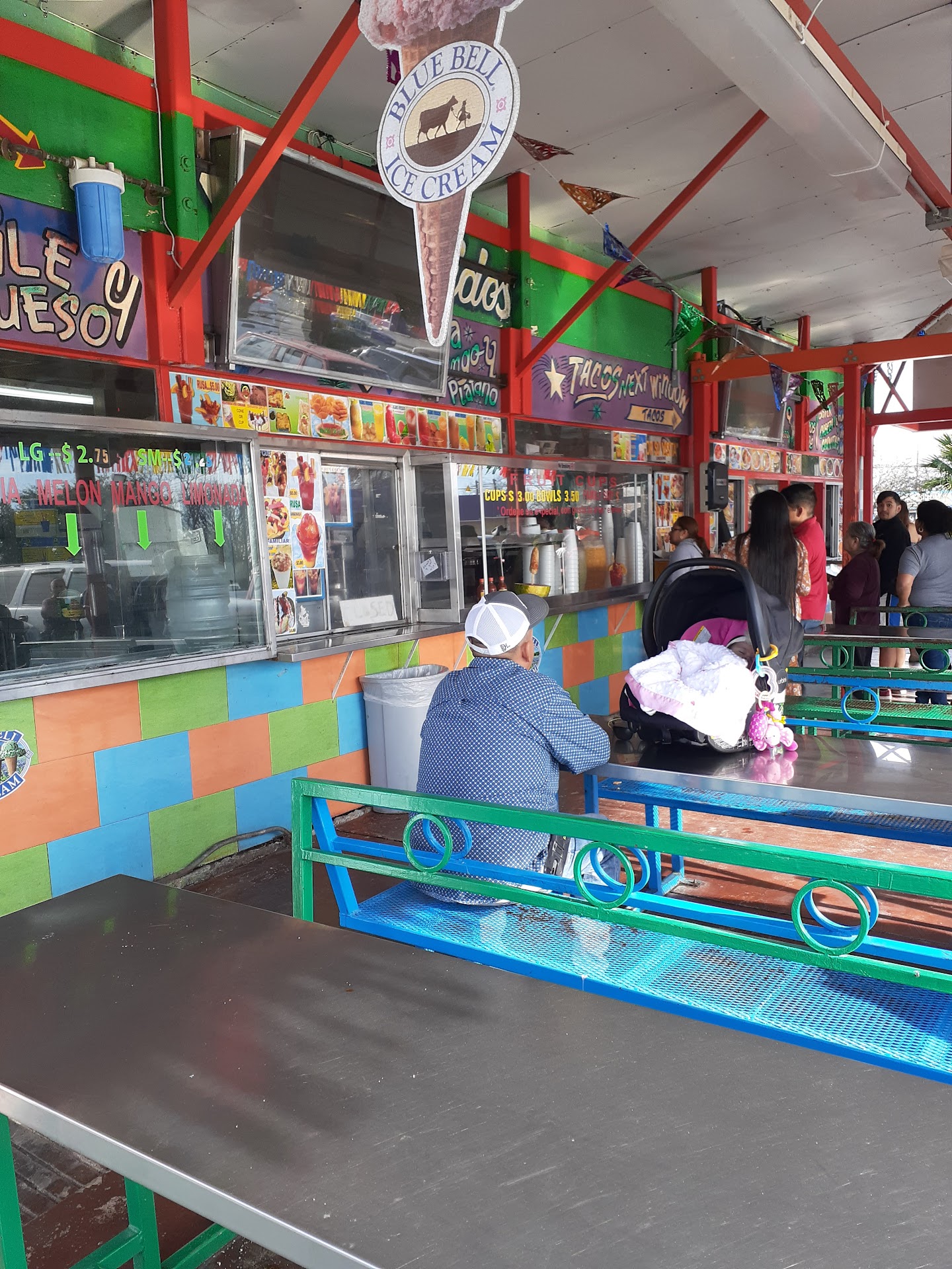 I really like eating here. There is a lot of seats and the cars come park right in front of you. There is strategy though when you go. You need another person because you can only order tacos in the taco line and fruit in the fruit line. You can get dessert in the fruit line. The lines are long but do not worry. The staff works hard to get you your food and they cut the fruit in front of you too. They have fruit cups made but they like to be ready for more people so they cut more fruit. The tacos are bigger than before. I do not like that but I understand. It if probably difficult to make those tacos. They messed up though because people like smaller things and can call them cute. You can't call these tacos cute. The drinks are really big and you need to be ready to eat the fruit while you drink it. Do not save fruit for end. This is for the drinks with fruit in it. If you drink the liquid and save the fruit and eat it after the fruit may get warm and I do it like the taste of fruit covered in sugar getting warm. If the ice melts you are really in trouble because it may go bad fast. It has a lot of sugar so be careful and make sure you check and estimate correctly how high your sugar may go. If you take insulin those drinks will throw you off. They are...