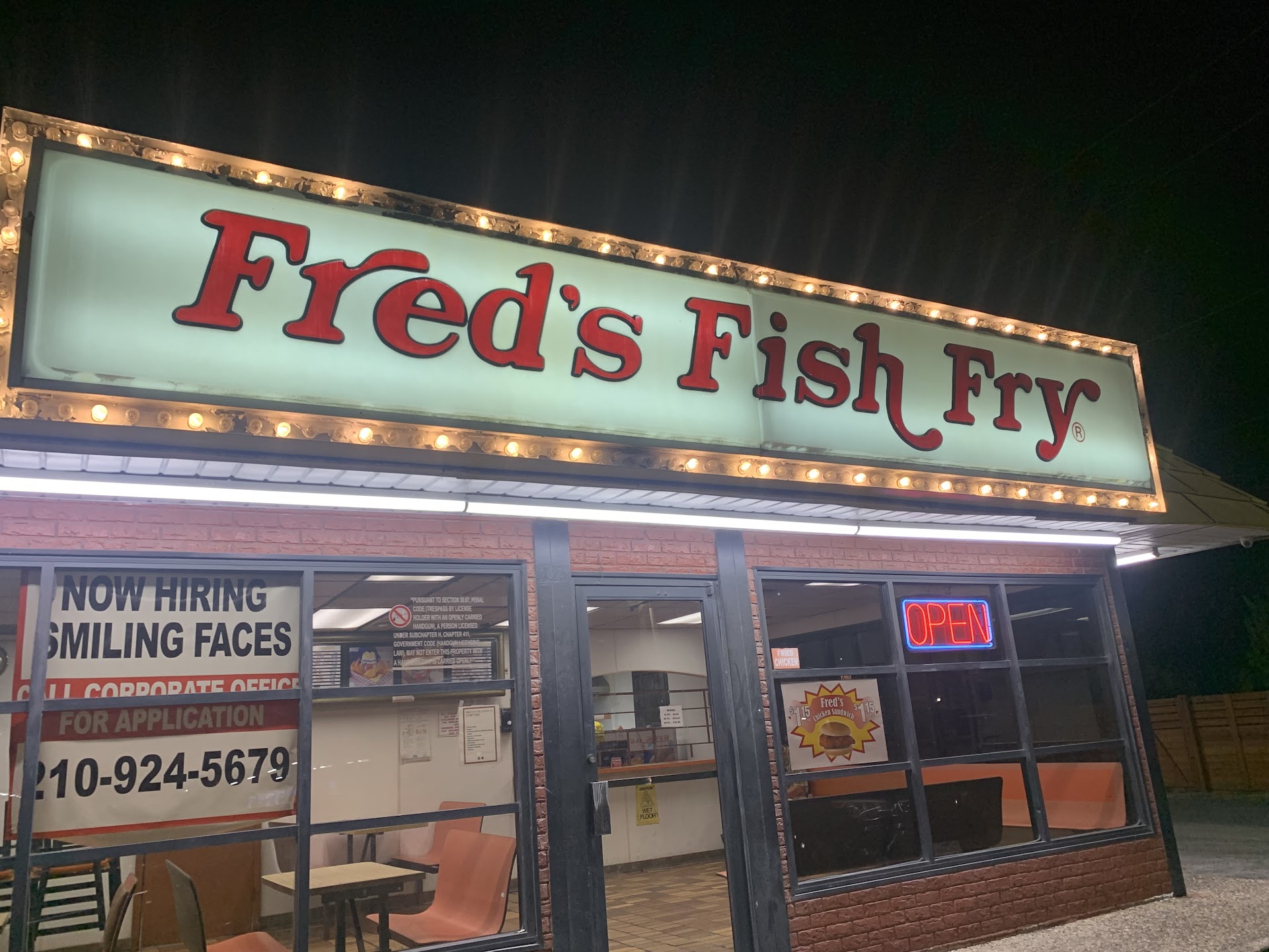 Ā Ā Ā Read moreNow let me just say it is with great regret I write this review . I'm reading done of these 5 star reviews and in my opinion they were either paid or extended family . I know this freds fish fry is nothing but a shell of its old self . It used to be good back in the day and it's been bout 6 months since I hit the one on nogalitos up also trash . So I ordered a seafood platter and the fish was fried in burnt grease and had the flavor to match . Wasn't no amount of tarter sauce saving this basket .over cooked over priced and fry pieces an inch long and let me say no good has come from anything an inch long lol . People accept it it's over I give it one more year until the reign is over . Fred getvit together man this is saddening...
