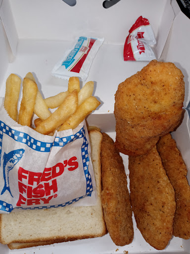 Read moreWell, the price for what you get is too high. For the same price I can get fish filets that actually look like fish and it comes with shrimp and your choice of several sides. Sorry Fred's, I've eaten there once and really don't think I'd do it again. I'm a single mom and I'm looking for a better value...