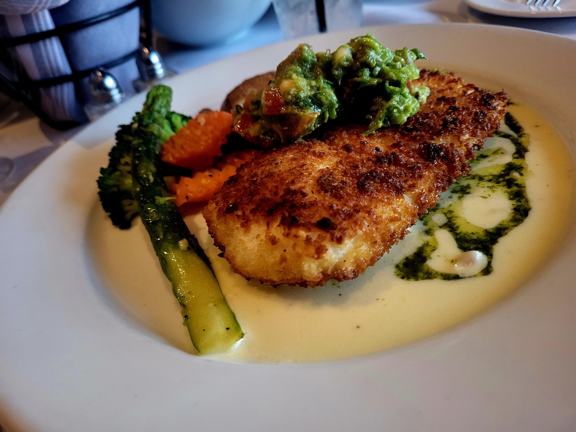 Read moreParmesan Halibut The carrots were slightly crunchy and a bit undercooked. 4/10 Broccoli was perfect. Had a nice savory steamed taste. 8/10 The potato was sweet. It was nice and firm, yet soft of the point of eating it comfortably. Wonderful. 7/10 Asparagus was nice and easy to chew. It adds to the accent of the flavor, but it also feels slightly out of proportion with the rest of the savory flavor as the vegetable itself tends to come bitter. Maybe a bit more seasoning. 5/10 The bottom of the Asparagus was very bitter and more on the crunchy side. 3/10 The pesto complimented the halibut very nicely. It has a nice twang to it that goes very, very well with the meat. 6/10 The fish itself could use some salt. It was nice, crispy, and flaky. I was slightly disappointed because of the lack of parmesan in the fish. I could barely taste it. The fish tasted amazing in the garnish 7/10 Garnish sauce. 10/10