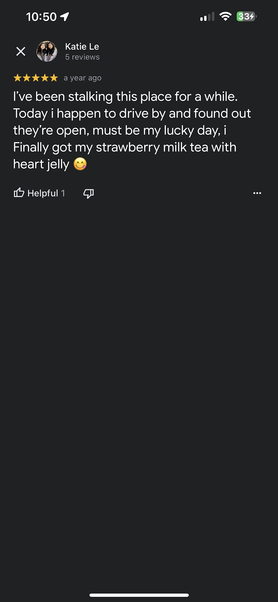 Read more(EDIT: They post FAKE 5 STAR REVIEWS) First time here and I won’t be back. I got a strawberry milk tea (medium/smallest size) $6.77 after tax. The tapioca/boba pearls are WAY TOO sweet. The first one I bit into made me gag and I wanted to spit it out, but they didn’t have napkins on the tables and there was no bag in the trash bin, so I quickly chewed and made sure to not get anymore up my straw. The chunks of fake “strawberry” don’t taste like strawberry and I tried to avoid those as well. And the milk is powdered btw (I know because I asked the cashier). A strawberry milk tea is my usual/fav kind to get at any boba place and is my unit of measure for quality flavoring. This place is way too sugary, priced high for drink size, and there’s only maybe four tables in that giant, barren shop. They were also playing country music? Odd. I chugged my drink to not waste my money or inconvenience the staff for a refund, and left ASAP.