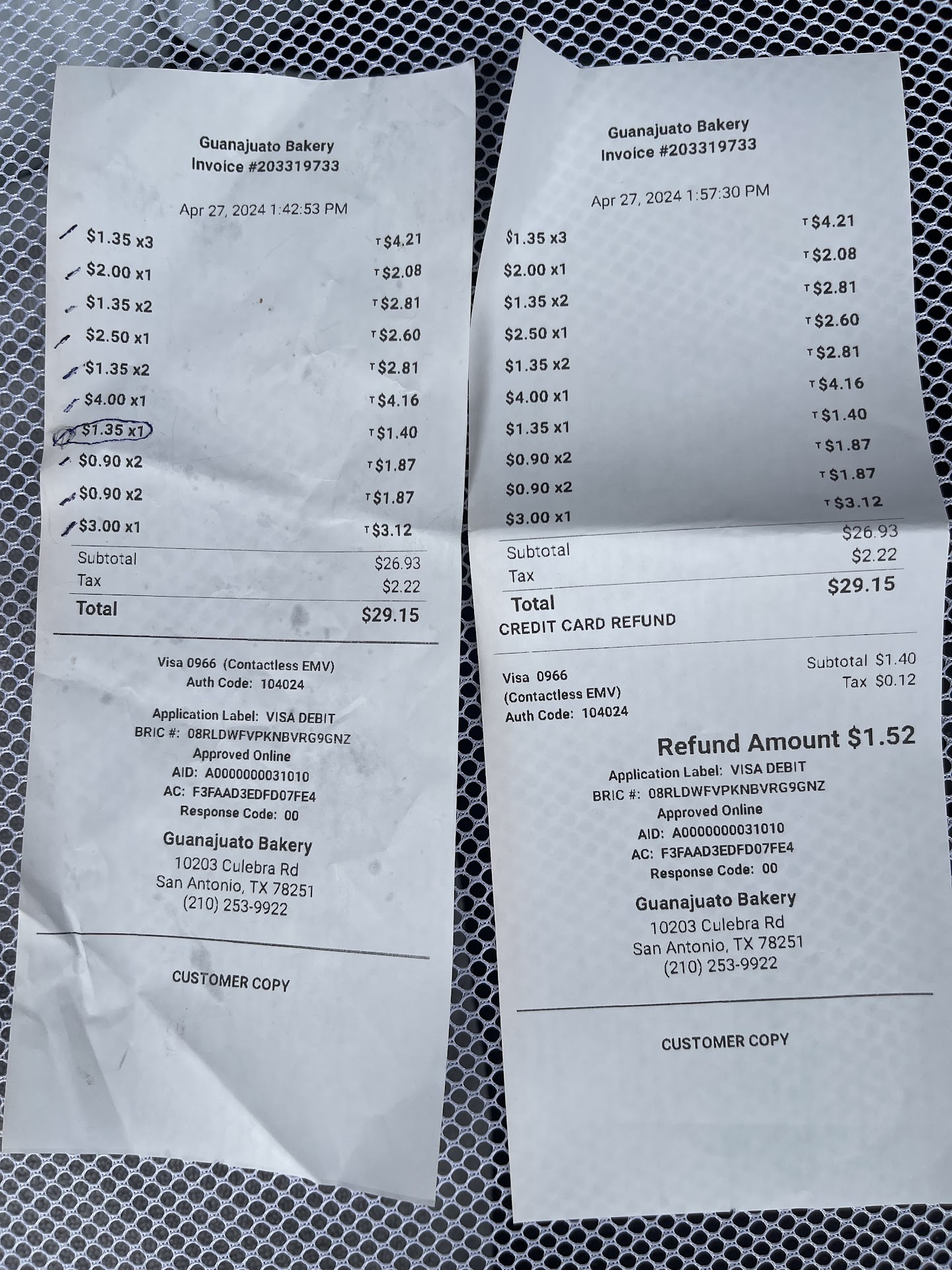 I had an unpleasant experience as the costumer service was horrible, I was overcharged, when I came in to address my concern (minutes later after reviewing my receipt) the lady that charged me started getting defensive saying she charged correctly I counted 15 pieces in my bag for a total of $29+with a charge of $4 which I also wanted to know which item costed that amount, on my receipt there were 16 items then she proceeded to say the $4 charge was for two orejitas meaning then there was 17 items so she made it worst because, she then gave me two extra charges, but continue arguing she charged correctly then counted the bread and tossing it back in the bag damaging it. Then she tried to make it seem like I might have taken the bread out and saying why I didnât address when in reality if she did her job right, I shouldnât have to be taking out piece by piece to count it, Iâm guessing thatâs why she gets paid to count, charge and provide costumer service. She offered my money but all I wanted was to be charged correctly, it was all simple math to count 15 items. She did ask if I wanted her to guess which item was an extra charge my common sense response was for her to know their own prices for each bread, as she initially charge them. Of course she ended up only refunding $1.52 as I was not told WHICH ITEM was it NOR did she disclose it, quite convenient !!