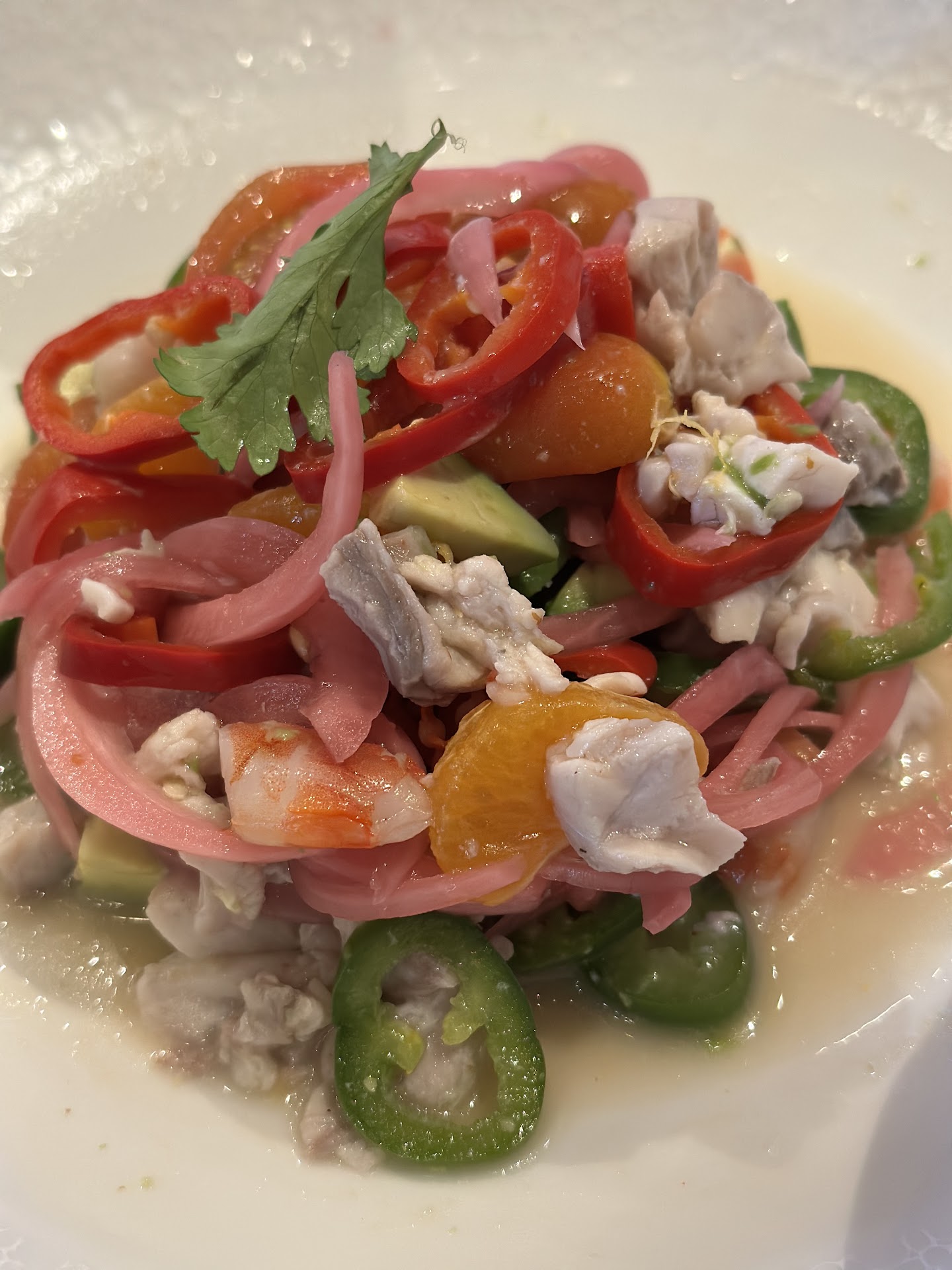 Our appetizers ordered with the drinks also showed up at the 35 minute mark. The ceviche was great, and a nice sized portion suitable for sharing. We unfortunately had to get 2 sets of silverware on our own as the table wasnāt fully set when we were seated. After enjoying our appetizers we had to prompt our waiter to place our entire order, this even after clearing the appetizers from the table.