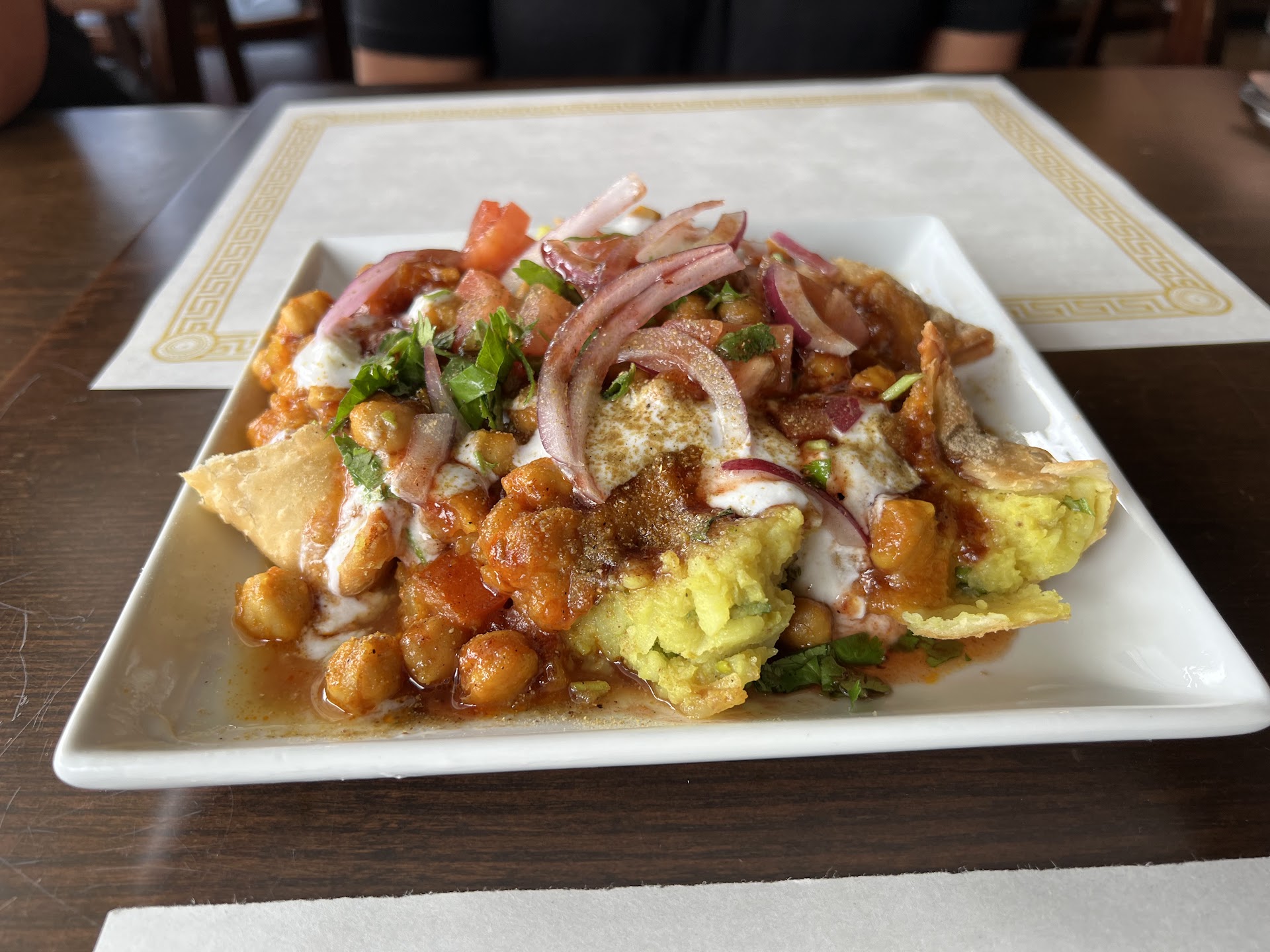 If you are still reading, thanks. We started the meal off with an order of Samosa Chat (Crisp fried samosa mashed and layered with chickpeas, yogurt in tangy tamarind extract with spices) and Vegetable Samosas (flaky triangular pastry filled with incredibly spiced potatoes and baby green peas). The chutneys served on the side were full of flavor. The Samosa Chat? WOW! Flavor bomb.