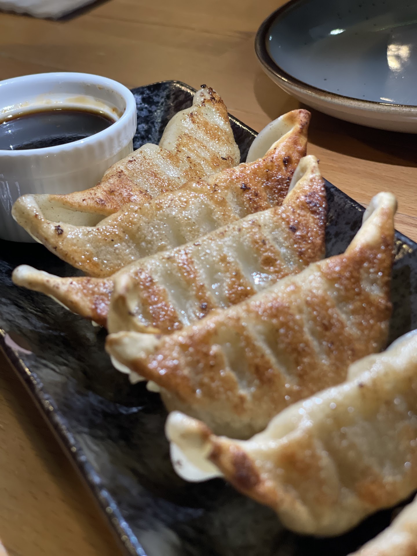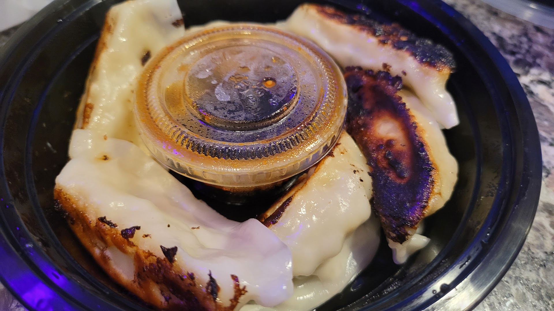 B. Gyoza - maybe in the rush of trying to get so many orders ready they left them on the pan too long? top looked great until you turned them over and they were almost pitch black and inside tasted good but the charred piece took away from the overall flavor. Hopefully this was a one off as i heard this was a great item to try with them.