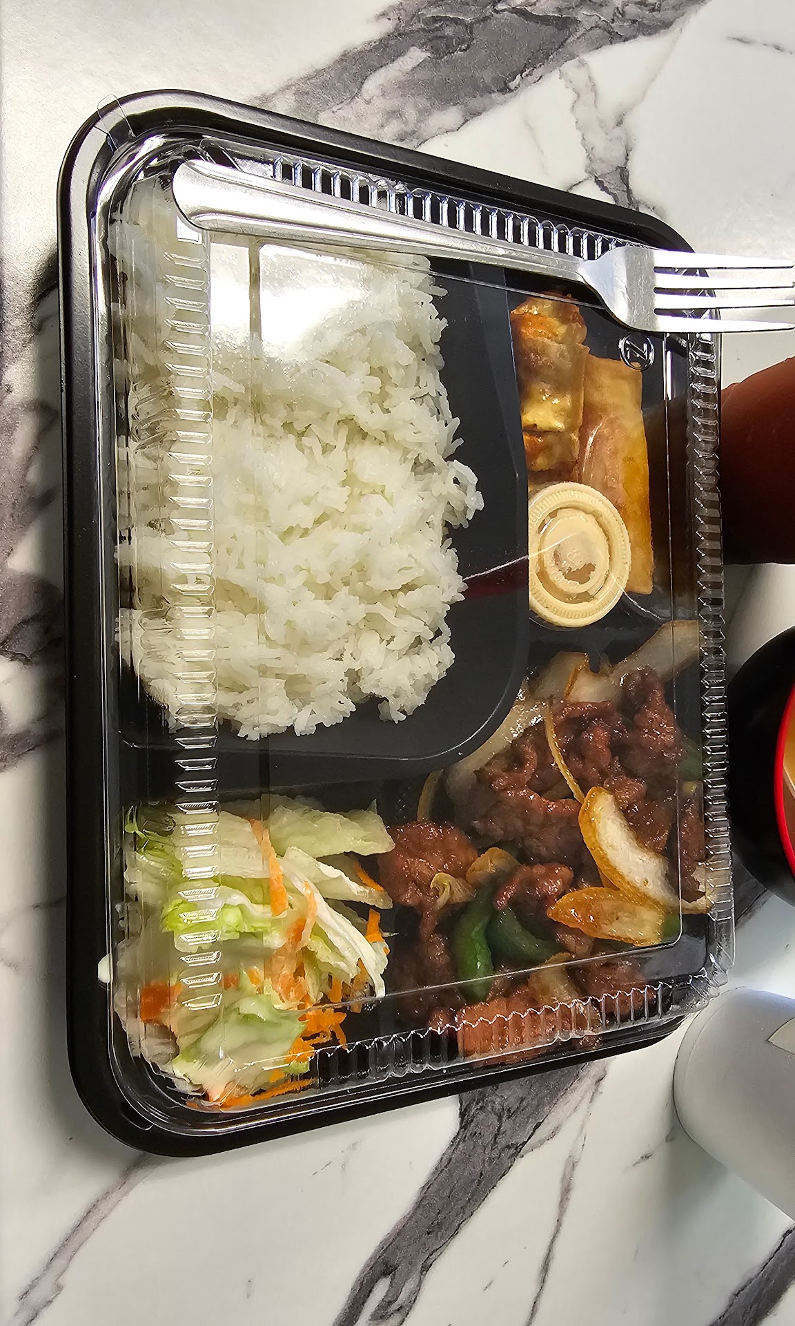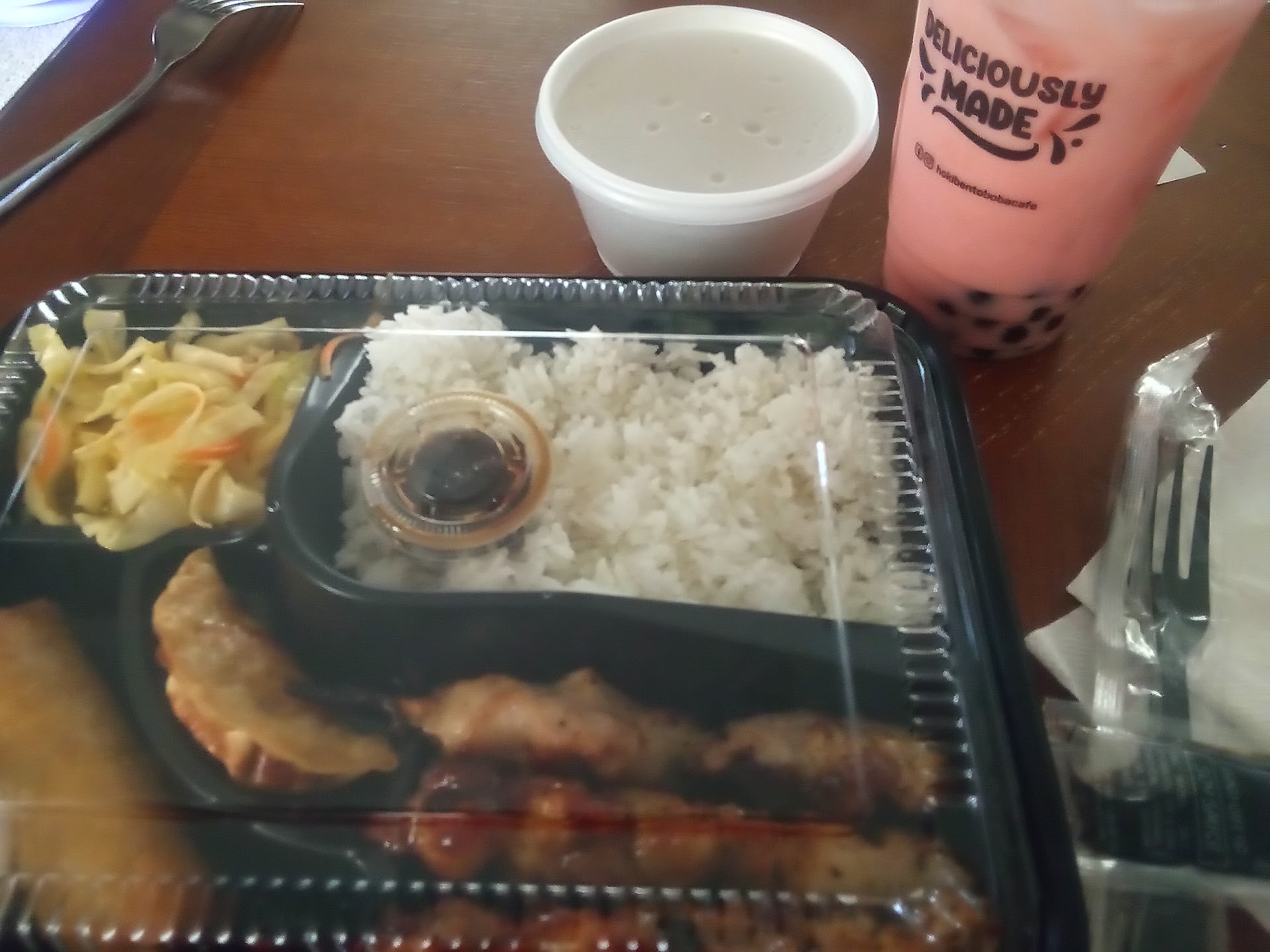 The bento came with a side of rice, sliced cabbage and carrots, chicken mixed with onions and green peppers, and miso soup. All of it had great flavor! I have zero complaints about the food. Good portions for an excellent price :)