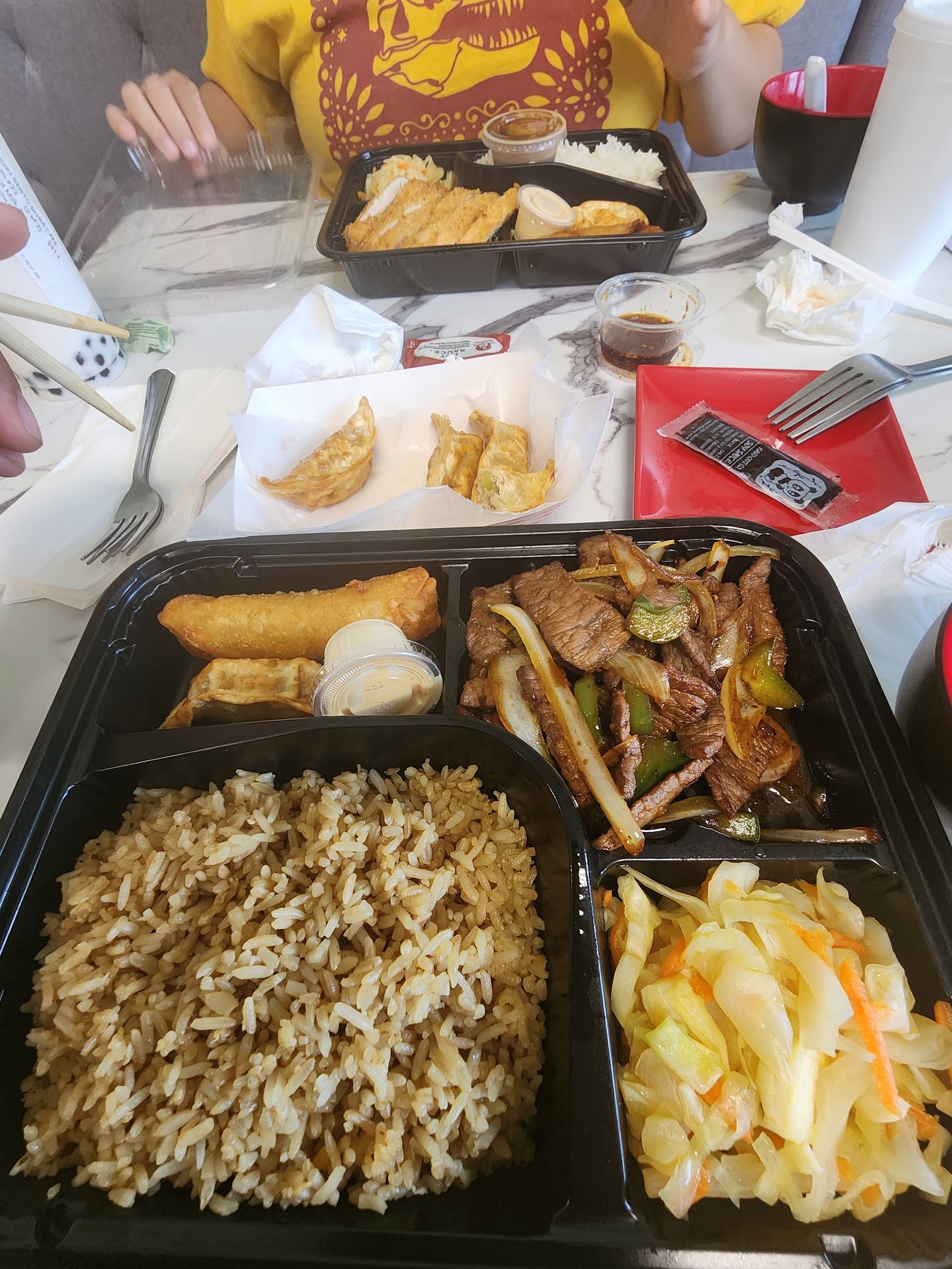 The food was absolutely delicious. Not one person had a complaint. Their ramen is really good. They seem to offer a lot of chicken katsu items and with good reason. It's quite good. Their milk teas are excellent, too.