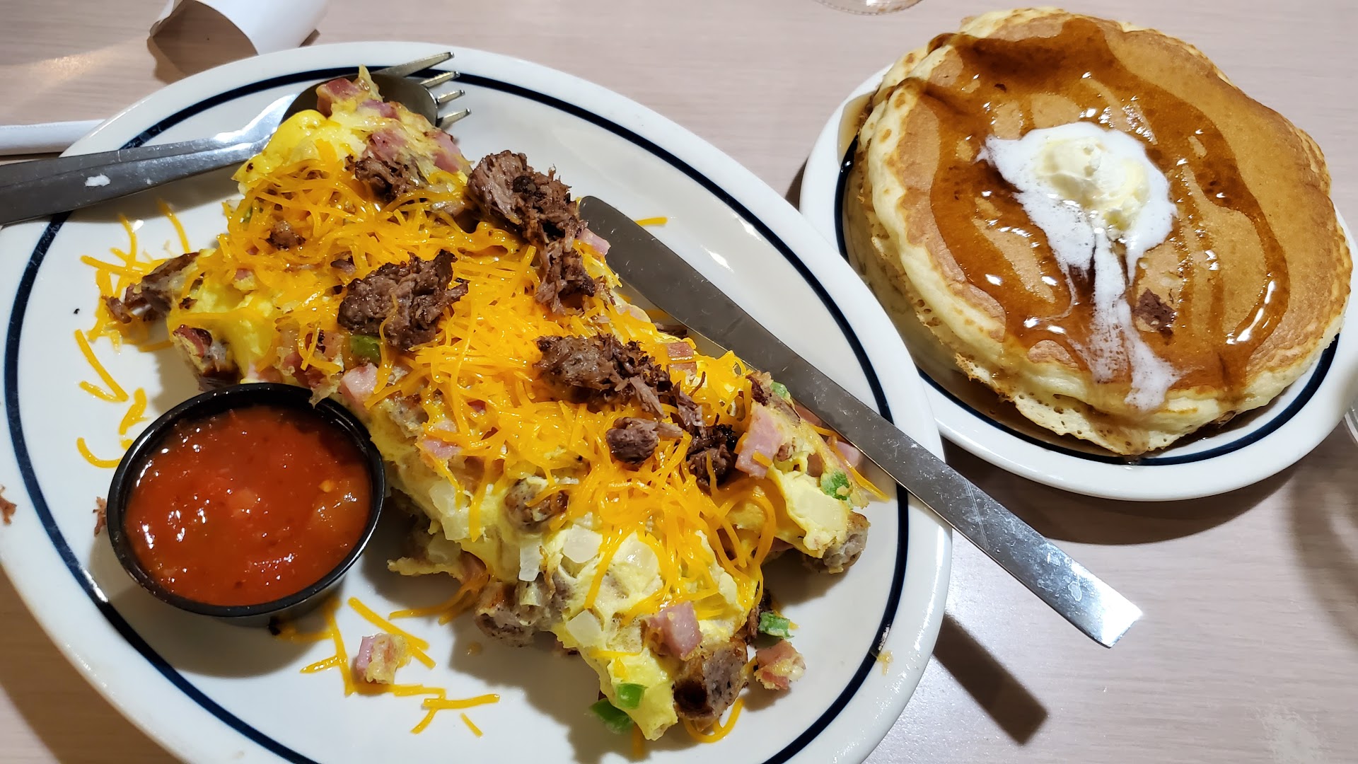 Read moreHonestly we felt bad because another customer came in by himself around 1am on June 6th and yelled at the staff because nothing was stocked and he got forgotten several times and finally called the staff out which made him look like a total jerk. Naturally we couldn't imagine why he would be so rude to the staff because they seemed nice. Then we figured out why. The staff wasn't rude but either they were severely understaffed or just not focused on service. My friend whom we we're with is super polite to anyone but they forgot half her order. We all shared two sets of silverware and had to ask for something to clean the sticky booth we were at. We spent about 20 minutes eating. Nothing wrong with the food honestly aside from an appetizer we ordered that never came. It just got forgot. The next two hours we spent waiting for a check that never came. Our waitress was restocking one side of the ihop the one closest to twin peaks talking to people who I think we're coworkers or friends, one was in a Mexican dress. (Looked pretty) but Ultimately had nothing to do with work and just forgot about us. We could have slowly walked out knocking glasses over and I genuinely feel nobody would have noticed. I still left a 5$ tip but it was just a formality. I honestly hope this was a fluke but this place is just not up to par these days. I think it's on its way to being shutdown or something. I know that's how the IHOP on Wurzbach and I-10 started getting before they closed it down. Hopefully whatever they replace it with will be proper and have some pride. I think all the staff were from Chicago. Our friend was heading there and that was the highlight of discussion. He's not really going there for boot camp. He's going to see his girlfriend....