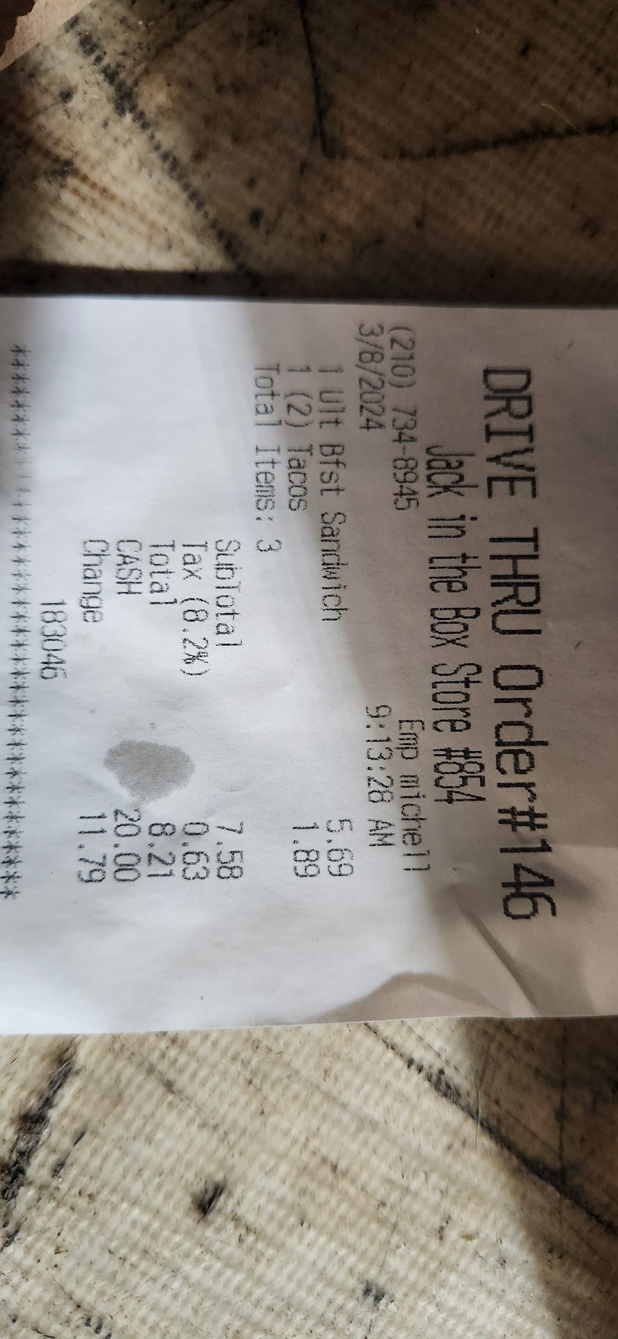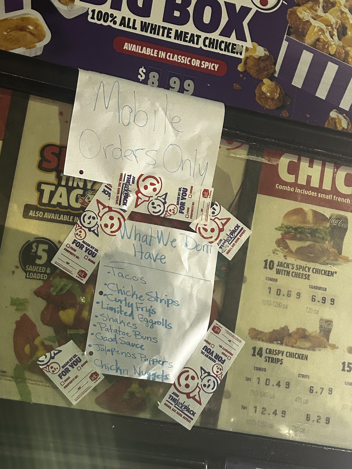 And on top of it all it must have been during a shift change because the person at the drive-thru window had no idea what they were doing, kept saying "can you give me a moment please" "thank you for coming to Jack In The Box do you mind waiting". Over 15 minutes later we got through the drive-through, and still had to wait another 9 minutes for food to come out to us. And the person that ran the food out to us from the drive-thru window, still forgot half the order.