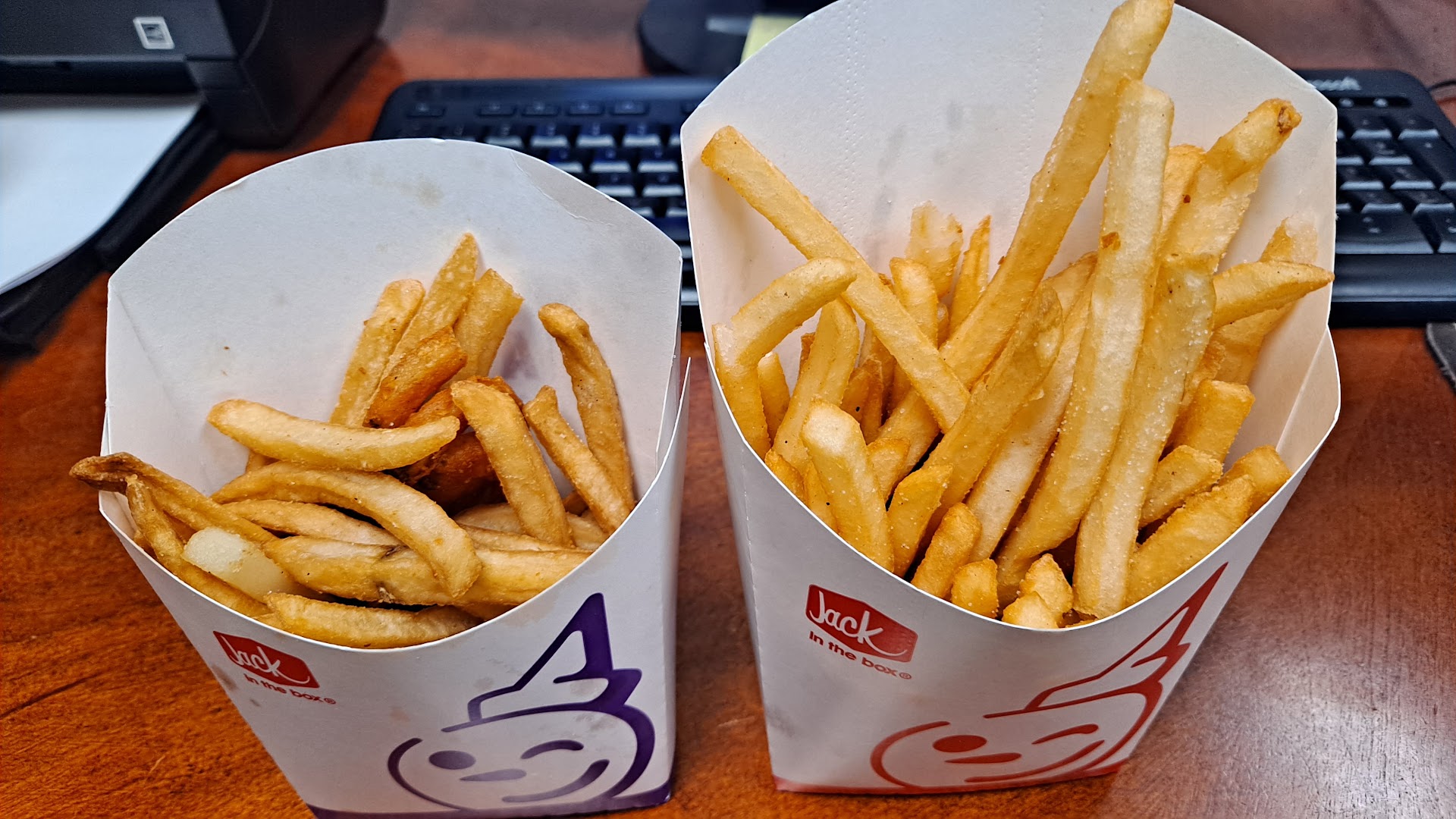 Read moreI went through the drive thru and ordered the new all American ribeye steakhouse burger with an order of fries and a rootbeer. Once I received my order without checking my bag I drove off and reached for a fry and it was cold and stale. Before leaving the parking lot I drive back around to the drive thru to let them I had just left with my order. Pulled up to the window and spoke with the manager who was working the window and showed him my fries. He was very polite and made me a new order of fries. The picture I took below will show the fries on the left are the stale cold ones, and the ones on the right are the freshly made fries. I didn't get to take a picture of my burger it wasn't all that great it was cold and I had the wrong drink but oh well that's my fault for not checking prior to leaving the...