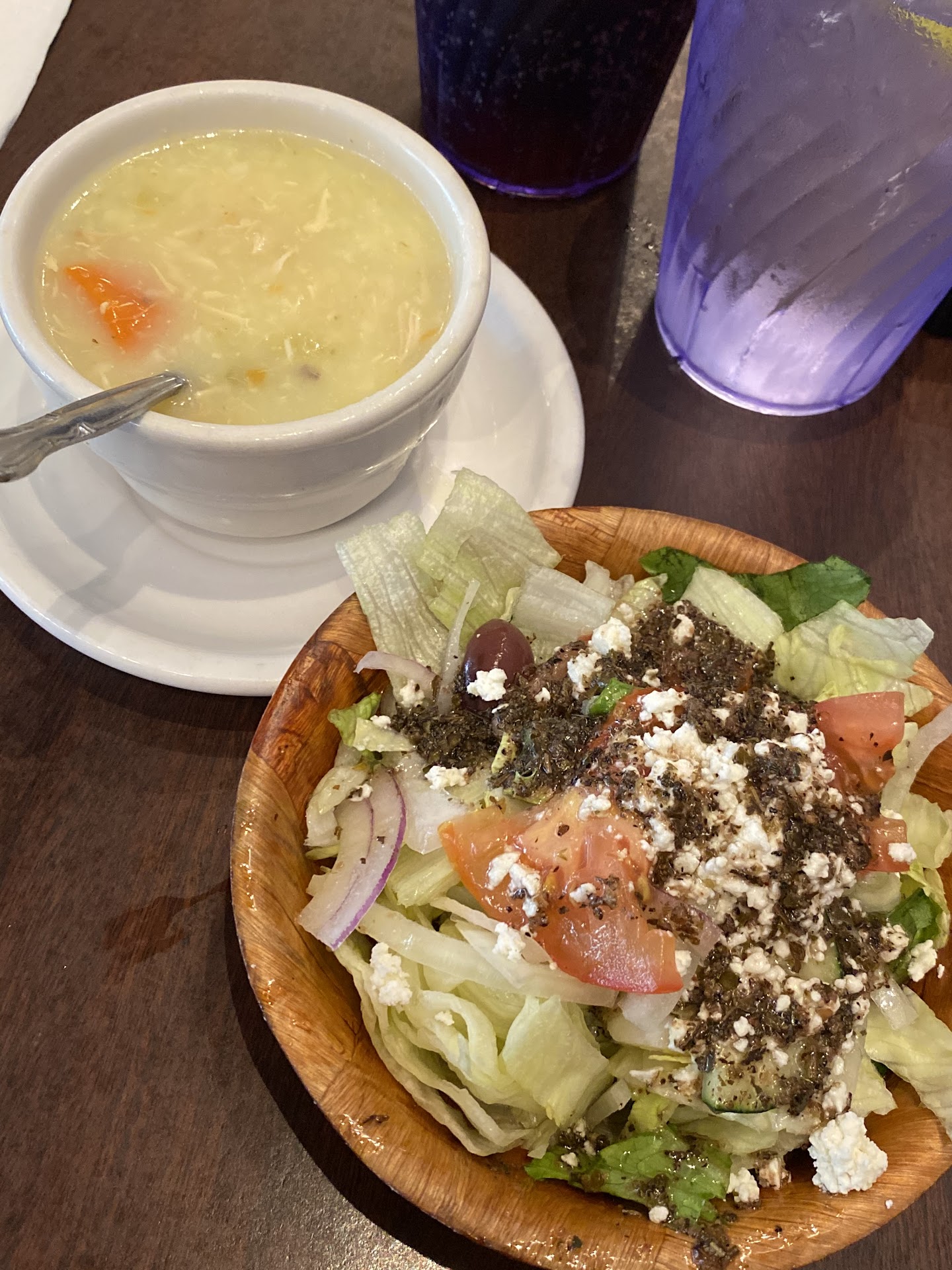 Read moreWhat a great lil restaurant and so well worth visiting with their great atmosphere! I've been here twice in the last two months (I live 45 minutes away). Once for lunch on a fluke while shopping in SA, and last night we drove all the way out for dinner. Had the same waiter both times, I think his name is Cole, what a wonderful waiter, he is attentive, kind and very professional and impressive despite his youth! For service, I'd give 10 stars if I could, thank you Cole!! The manager came out and made personal visits to all the tables and was very warm. The menu is very authentic and delicious, very much a taste of home! Many dishes are just like what we fix at home with no labor lol. Staff is detail oriented and were happy to accommodate changes for my dietary needs in every dish! Saganaki, brandied flaming cheese, prepared at table side is really is a must. The avgolemono soup is on point and like a warm hug! I had the lamb souvlaki which was amazing on my first visit but a bit tough last night (one star down for the tough meat). The salad with a 5 star dressing and my side, eggplant, was delicious to say the least! We also had their combo plate, a very very good way to try a little of so many dishes. Pita was buttered, seasoned and toasted, can easily turn into an obsession which is by far better than my homemade version. An absolute MUST try is their shrimp appetizer OMG!! talk about flavor town, I've never had shrimp that was this flavourful! I was disappointed that they were out of braised leg of lamb but everything we had was so good, we'll be happy to go again maybe a bit earlier for dinner and hopefully before they sell out again. We ended the meal with baklava which tasted freshly home made and just like mine but less work. The only other disappointment was the lamb gyro, it was underseasoned and tasted highly processed. Considering the rest of the menu tasted so good, I expected better so I wouldn't recommend the gyro (the other reason one star was dropped). Give this place a try, the menu is large and price point is low to moderate, about $11-$30 per main dish. We spent around $60 for shared appetizer, two full meals with add-ons and...