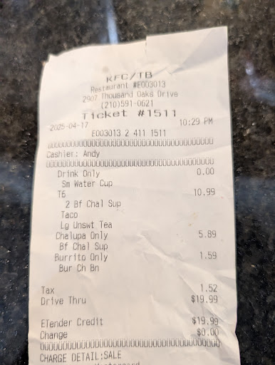 Read moreI'M ALIVE NO THANKS TO KFC ON THOUSAND OAKS This KFC set a new low for bad fast food chicken. I came in and it was empty, that should have been a WARNING. So, I went up made my order and was greeted by two employees. A shift leader and an employee. So, I asked for a pot pie, two legs,and a BOX of fries. Now I ask the employee the price for just chicken she said 6.49. I replied yall robbing me and laughed, then the Manger came and handed me the pot pie and I wasn't even done ordering. Then the Manger said if you want white meat will give it to you for the same. Of course I said yes. Then I said to employee don't forget the box of fries, she punches something in and the price pops up 4.99. So, I'm expecting a HUGH CHURCH'S CHICKEN BOX. YOU KNOW WHAT I GOT..PotPie had set under heat so long one side was xtra dark and it was so light on filling, I should have went to Heb for pot pie. Chicken Breast had no skin looked like somebody ate the skin off the breast. That's best part.lol. Leg that smelled like fish and a Large fry with the weight of a medium carton, cold floppy fries top it off.They charged me 19.45 for food that if I had eaten could have possibly caused me to get sick 😫. I have Lupus and had to walk Because I can't afford delivery and the thanks I got was foul food. I called cooperate but I still don't have my 19.45, but you guys, I'M ALIVE..THANK THE...